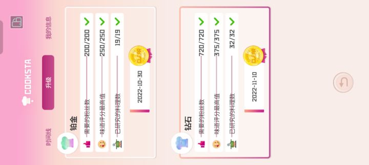 如图,寿司店已经升到钻石了,但是铂金和钻石的成就都没获得