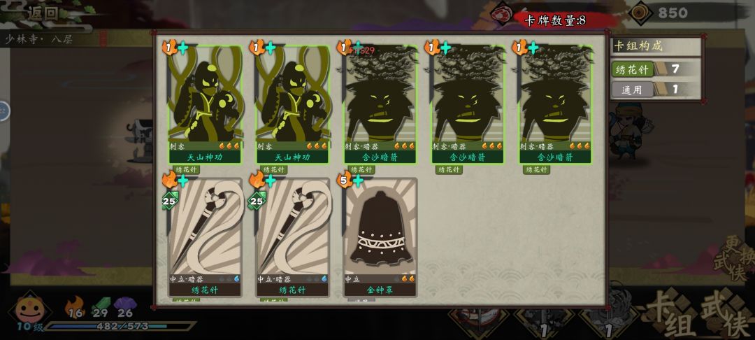 #奇想江湖 ps:太非酋,4个神话宝图+江湖通典+86个改造石,有用的就一个紫色行云!!!!太黑了 1、用鹰王+铁尸自带卡牌渡过前2层,然后看情况有没有袖里箭+连弩,没有就转针。 2、地图最好是冰火岛,有开局怒气装备的套装,套装选择忠武、紫金、无相、清虚。 3、针流最好的卡牌是含沙射箭,不过拓印的会影响后续观音泪的获取率 4、构筑就是2蚕丝银针+1天女散花+3连弩+过牌,过牌除了下面我用的那些,