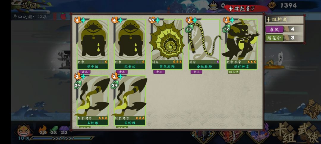 这里分享一下思路,无化形,核心朱雀剑升级银环仙子武学银环神掌,触发符石诡计狂烈上疯狂词条,配合银环仙子被动后续4张牌都附带疯狂,然后蛊王的武学负责上基础毒,配合玉蛇锥+观音泪叠毒。金蛇软鞭触发毒伤杀一个,另外一个直接毒死。核心装备清虚套,四象套将初始牌全部抽上手。速度还行,有赤练稳定度也还可以。#攻略