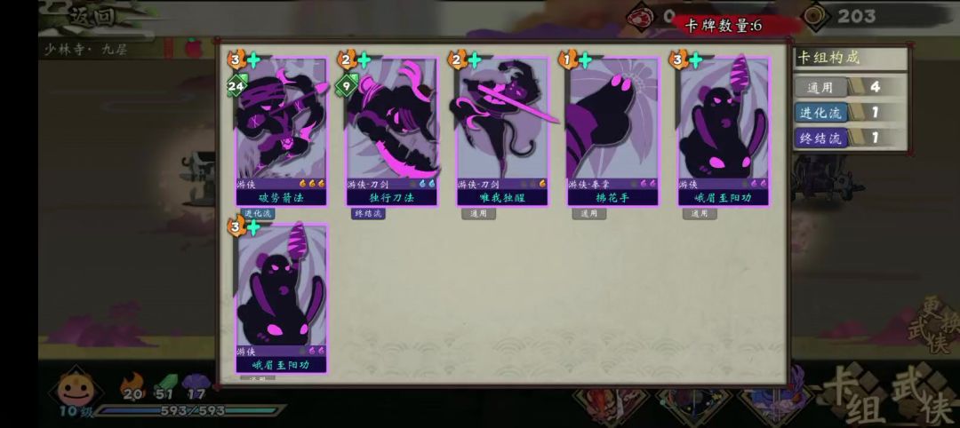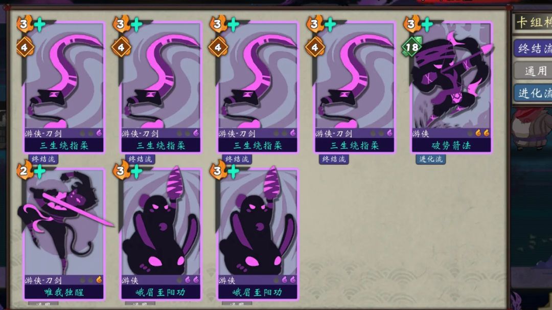 主要人物 弯弓奇侠郭靖(大漠英雄令获得)东海灵女郭襄(生涯获得)都是不需要抽开局的人物 完整卡牌构筑 开局用升级过后的唯我独醒保证怒气足够 三生绕指柔叠郭靖武学进化次数 还能白嫖怒气 两张峨眉至阳功没有限洗词条下可以无限循环 装备套装以怒气和生存为主 可以再开一套三生搭配绕指柔叠进化次数 神兵必带屠龙刀(删牌保证卡组精简)星弧(给郭靖武学上乱舞虹吸倍伤) 我这个固有没必要 洗成虹吸最好 但是无所谓