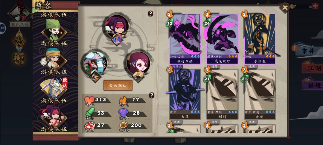 感觉很多新人小伙伴疑问很多,给目前版本简单一个开荒攻略。 首先开局抽,游戏共四大阵营,豪侠、刺客、游侠、气宗,有些武侠是可以通过活动和布偶商店兑换的,有些是只能从图书馆抽取的。所以如果想开荒顺利点,那开局抽的重心就在后者身上,这里面刺客的玉面毒君,游侠的无意剑客,气宗的滇南世子比较重要(还有一个气宗的演山真人也是只能靠抽,他是阵法流的核心,成型较慢,不适合开荒)。玉面是毒刺流核心之一,无意是融剑流