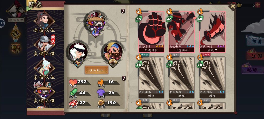 感觉很多新人小伙伴疑问很多,给目前版本简单一个开荒攻略。 首先开局抽,游戏共四大阵营,豪侠、刺客、游侠、气宗,有些武侠是可以通过活动和布偶商店兑换的,有些是只能从图书馆抽取的。所以如果想开荒顺利点,那开局抽的重心就在后者身上,这里面刺客的玉面毒君,游侠的无意剑客,气宗的滇南世子比较重要(还有一个气宗的演山真人也是只能靠抽,他是阵法流的核心,成型较慢,不适合开荒)。玉面是毒刺流核心之一,无意是融剑流