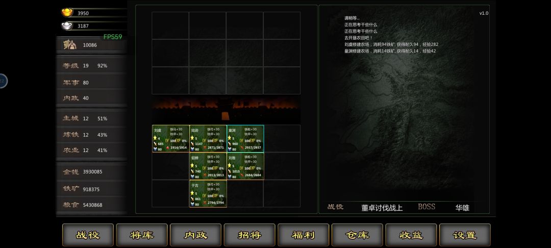 以前就喜欢玩三国游戏,什么吞食天地,三国志,霸王大陆,这个是非常好玩的三国文字挂机抓将游戏。 开局推荐有刘备99魅力,适合抓将,用元宝买将,找4个96魅力以上的将,推图到江夏,抓大乔,把大乔升到6星,到黄一挂机