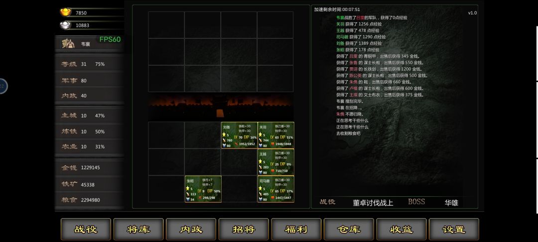 以前就喜欢玩三国游戏,什么吞食天地,三国志,这个是非常好玩的三国文字挂机抓将游戏。 开局推荐有刘备99魅力,适合抓将,用元宝买将,找4个96魅力以上的将,推图到江夏,抓大乔,把大乔升到6星,到黄一挂机。 建议开启2小时离线或者双倍效益,毕竟单机挂机游戏。