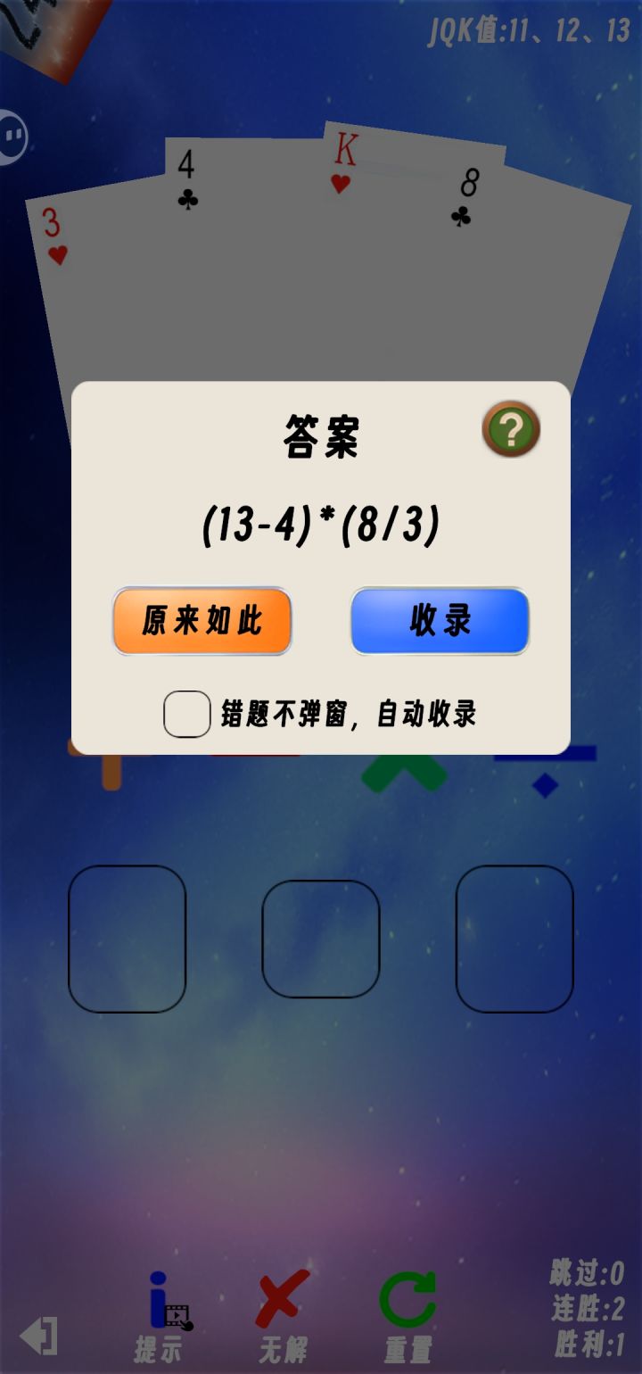 1、游戏中点击退出按钮,不会打断连胜2、增加答案提示弹窗,在答案提示弹窗点击【收录】可以将题目收录到【错题集】里,方便后续回顾;也可以设置不弹窗,则用回旧版的飘字提示;使用了【提示】的题目会自动加入【错题集】3、增加【速解集】,可以从【错题集】里选取题目到【速解集】,在游戏中再次遇到【速解集】里的题目时,会出现【速解】按钮,点击【速解】按钮可以直接答对题目4、增加背景音乐和音效5、增加卡背