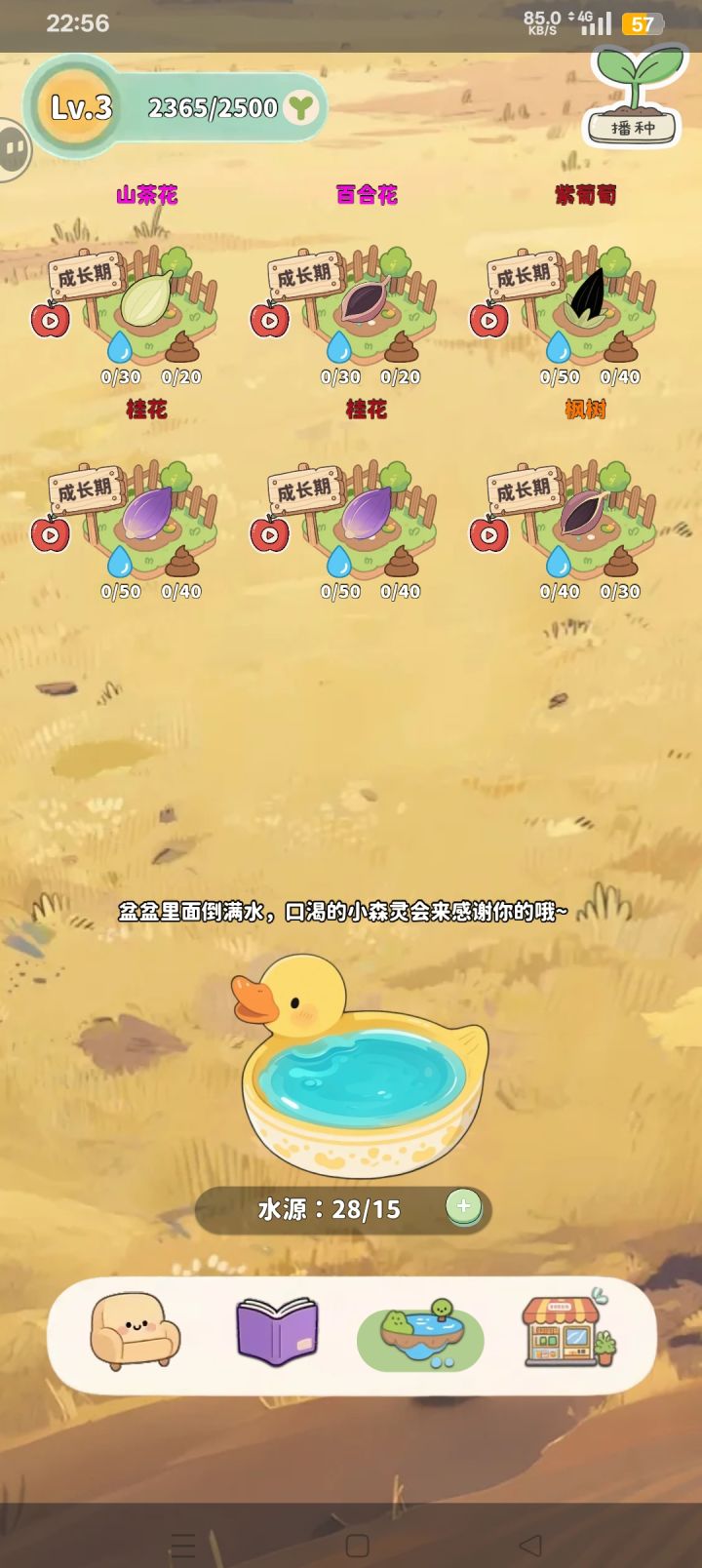 喝水的小精灵会随机给一些种子或者生机。但是没钱还是只能看视频,买不起肥料和水,也是只能看视频。肥料和水不是催化条件,而是硬性条件。