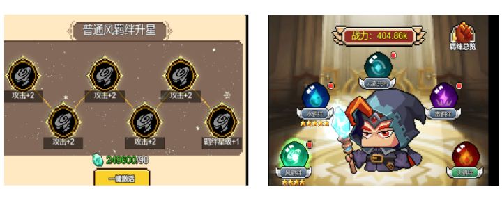 一、主角养成 主角有一条关于元素羁绊的养成线,玩家可以通过消耗对应的元素晶石进行强化升星,每次升级都会有一定的属性加成哦。一个星级里可以强化提升6次属性,而点亮6次后将会使元素羁绊提升1星。 当一个元素羁绊达到5星满强化后可以进阶,进阶需要消耗珍贵的元素晶核,相对应的,也能够提升对应元素英雄爆伤和攻击百分比这样的强力属性哦 元素同样拥有品阶机制,更高阶的羁绊,每次强化所增加的属性也会更多,而