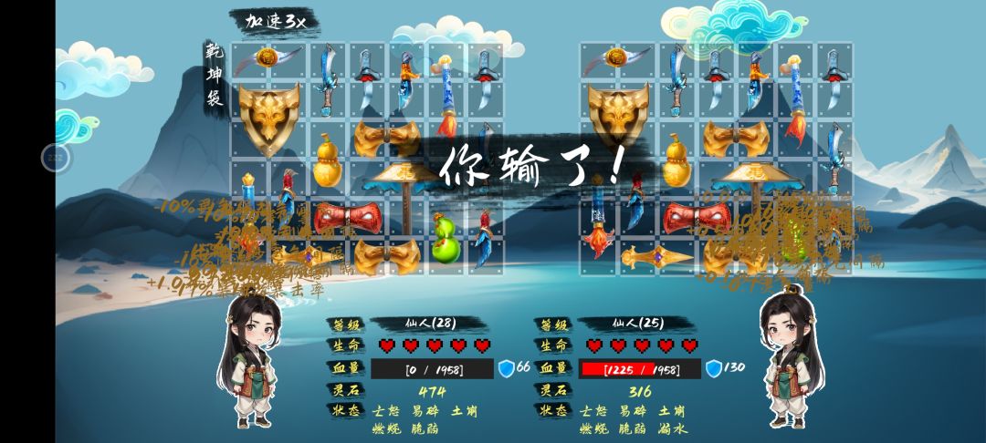 附图不知道算不算通过,给我护盾干乱码了好像 简略讲下:因为有灵气入体这种机制,所以大号装备优势就很明显,因为格子多,灵气入体更快,可以更快打出装备的效果,其中灵气相关的buff很重要,影响你灵气入体的速度,数量,频率,前期就无脑怼这种大号装备,不然你干不过人家,后期补点叠盾的即可,同等装备直接拖动升级。 优化:达到几百回合之后,根据护盾量?输出?还是什么判负,不然后期盾叠起来,可以打到宇宙破灭#