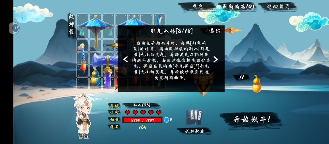 首先这个游戏不推荐看攻略,策略类的游戏,内容比较少,看完就没什么意思了。实在不能入门的可以看看。 暂时只提供大概思路,具体武器数据看后面有没有需要再决定是否补充 装备 流过装备的灵气量足够就会出手一次 前期 堆引气间隔,运气间隔,灵气量,多准备一些 引气运气越快、灵气量越大→出手越快→ 中期 堆一些赚金币的,为后期准备 后期 堆回血回盾 将灵气相关的装备放在背包最上面,然后是攻击,最后是回血回盾。