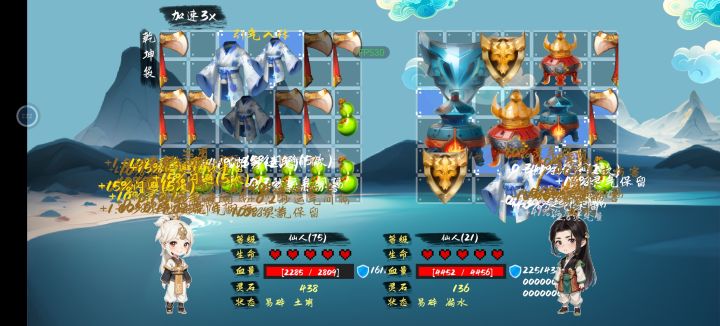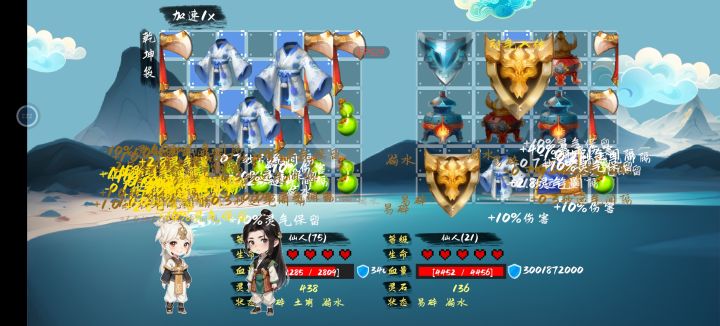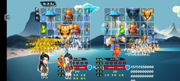 附图不知道算不算通过,给我护盾干乱码了好像简略讲下:因为有灵气入体这种机制,所以大号装备优势就很明显,因为格子多,灵气入体更快,可以更快打出装备的效果,其中灵气相关的buff很重要,影响你灵气入体的速度,数量,频率,前期就无脑怼这种大号装备,不然你干不过人家,后期补点叠盾的即可,同等装备直接拖动升级。优化:达到几百回合之后,根据护盾量?输出?还是什么判负,不然后期盾叠起来,可以打到宇宙破灭#