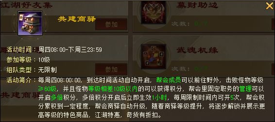 大侠们好呀!如今的江湖,野外怪物遍地都是,却只掉少量经验和图鉴,挂机动力早已被消磨殆尽……龙妹理解大侠对野外挂机收益的需求,于是:【帮会商驿】应运而生!从今往后,挂机杀怪,积分换宝,激情打架!【帮会商驿】北宋年间,辽兵铁骑踏碎边关商道,商贾断途、民生哀鸿!为保护商道,守江湖命脉,中原武林各帮派歃血为盟,急遣精锐弟子驰援,与辽军展开殊死较量!最终,各帮派成功保卫商路,并吸引诸多商贾入驻,形