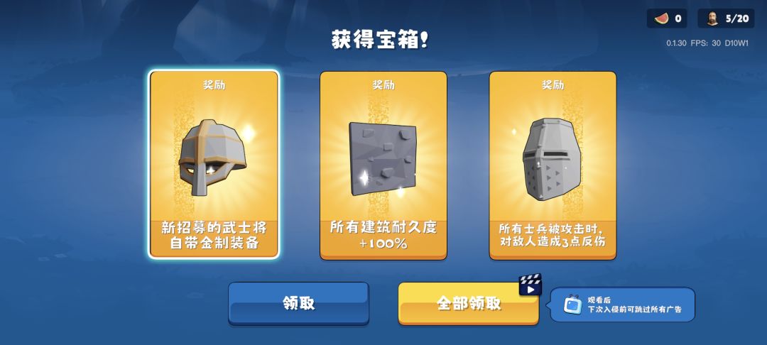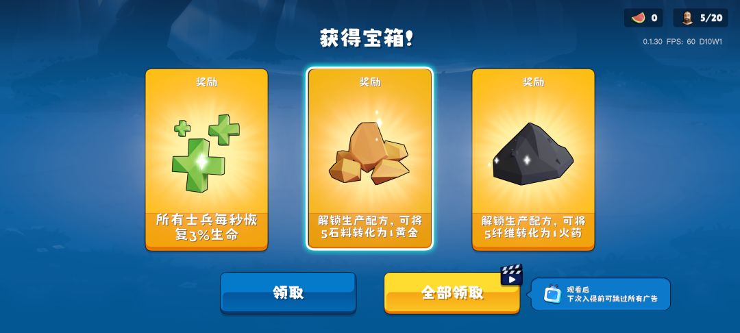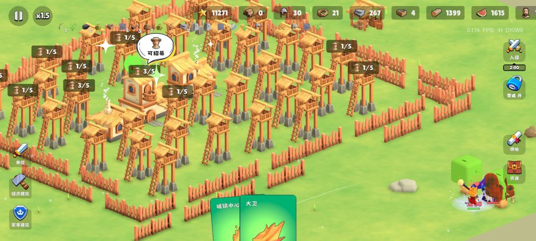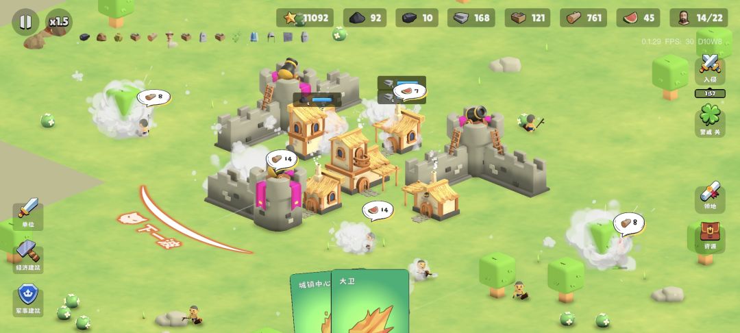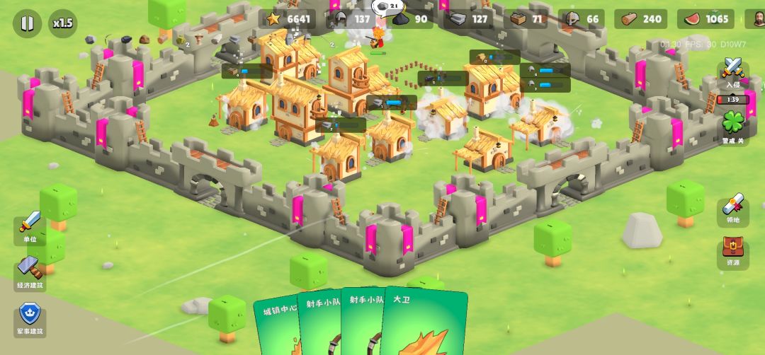 起手先把前三个工人招募了,一般升级上来了之后第一波收集就能招募出来,然后把二十五纤维提升工人速度和背包的那个点上,接着在中心里面把食物和木头点个两三千(长按可以快速增长),然后点右、下和右下三块地,都没有怪,有一道两个宝箱,然后等到怪物到前三十秒的时候看到怪物入侵方向之后在那个方向建石墙,接着推迟两次。然后建造两个牧场,把工人招募到十五,留四个位置给士兵,加上卡的那一个位置有五个士兵,接着在工人招