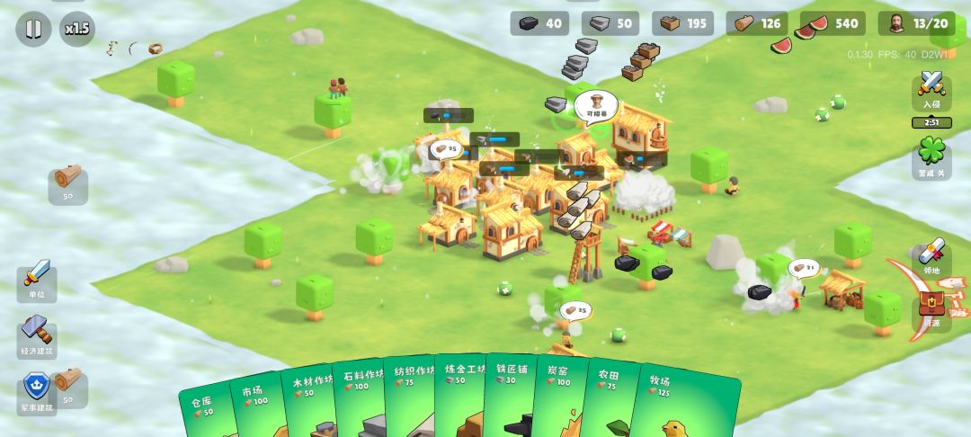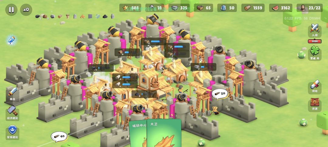 目前已全通,10分钟一把,开局看一次广告,然后延迟进攻两次,不行就3次,第一波加速没奖励,后面加速都有奖励,成型了就可以全部加速进攻 科技优先资源类,人口上限,开局农民,空投宝箱+2,然后看你要走的流派优先建筑攻击或单位攻击。 建筑按木,石,纺织,碳,铁,炼金监造。有石板就造石墙塔围一圈,造一个石墙用来升级防御力。 炮塔流:硫磺是关键,前期要多开图找到硫磺矿,用大卫清兵。四个炮塔分四角即可通关。有