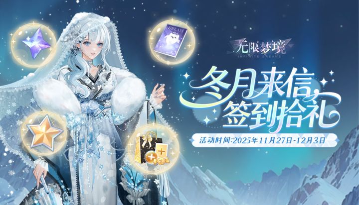 当梧桐叶铺满街角,当热可可的香气漫过窗台,冬月的风带着感恩的絮语,轻轻叩响了入梦师的门扉。感恩节至,暖意渐浓。北北邀你共赴一场冬日的惊喜之约~ 一、活动入口游戏内-梦境管家-冬月来信,签到拾礼 二、活动时间即日起——12月3日23:59 三、活动区服11月27日已开区服,仅限官服开放 四、活动规则~每日福利~冬月的风裹着感恩的温度,北北从11月27日起,每天开启一份惊