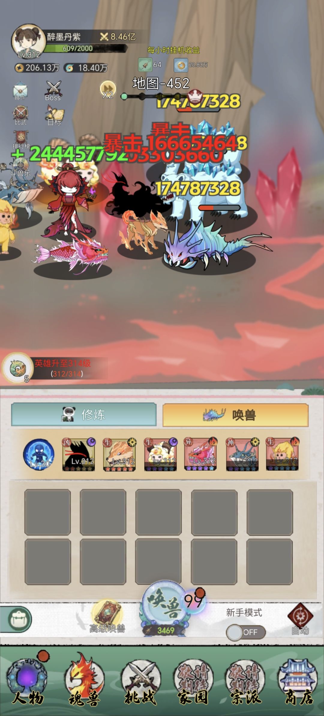 游戏的核心是斗兽。 点击焕兽,一个铃铛召唤一次,点击焕兽旁边那个圈圈是兽笼,上面有等级和抽卡几率,20级可以抽红! 焕兽栏为10格,装满后唤兽会变味斗兽,战斗力最高的宠物会吃掉其余所有怪兽获得经验升级,每10级可以突破一次。普通突破消耗铜币,怪兽突破后可以继续升级,不改变任何属性,高级突破10分钟一次或者使用玉100/次突破,有几率高级突破成功,变成更高级的怪兽,紫色变橙色20%,橙色变红色5%。
