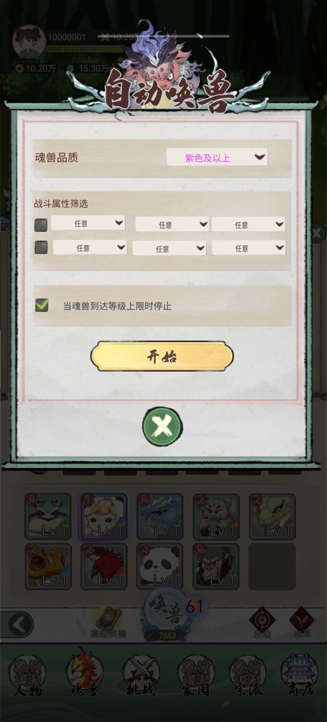 1,点击开始,就会不停抽卡,抽到10个格子满了就会自动斗兽,保留战斗力最高的一个。但如图中所示,勾选了紫色及以上时,当你自动抽卡抽到紫卡橙卡红卡时,就会停止自动,需要你再次点击自动界面的开始启动。这是为了防止你抽到了暗羊,暗狼时自动把他给吃了。同理,选择橙色及以上,遇到出现橙卡红卡时就会停止自动,但紫卡不会,会继续自动抽卡斗兽,把紫卡吃掉,这适用于已经具备暗羊暗狼的同学使用。 2,勾选当魂兽达到等