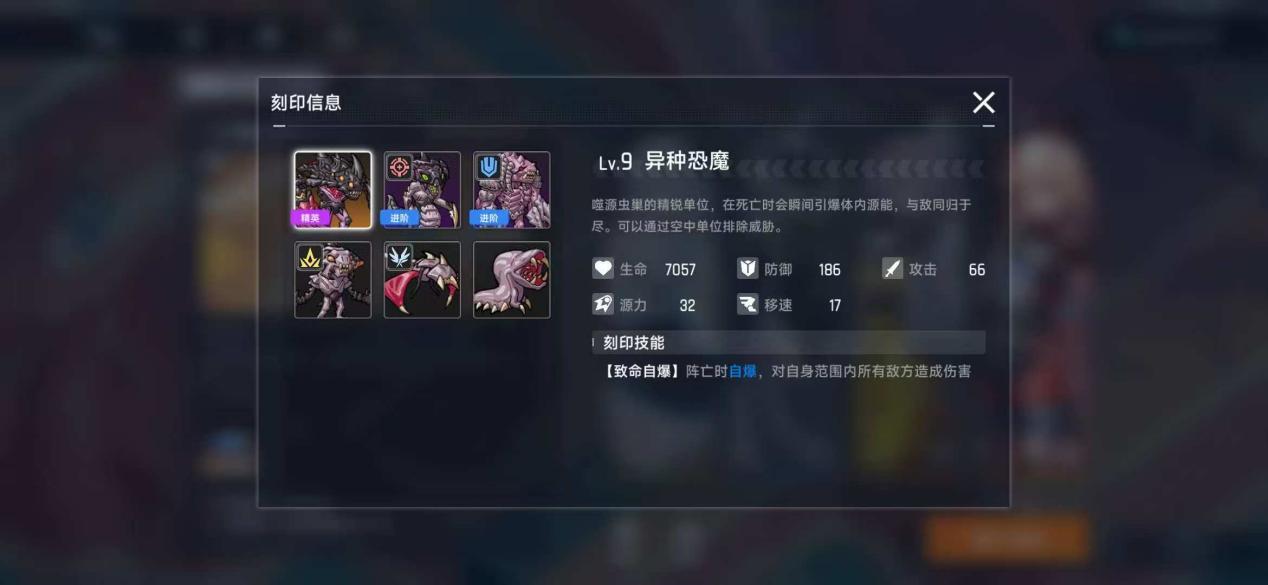 【金色荒野】的刻印还有很多,今天,咱们接着看看还有哪些刻印?! 异种恐魔 异种恐魔是噬源虫巢的精锐单位,是毫无思维的扭曲生物。它的刻印技能【致命自爆】,能在自己死亡时,将其体内储存的源能瞬间引爆,对自身范围内的所有敌方造成伤害。面对异种恐魔的自爆时,指挥官还是躲为上。 尖牙虫 尖牙虫是噬源虫巢的低级单位,拥有简单的生物结构,能够直接在战场上孵化出来,再配合强劲有力的巨颚,常常给指挥官带来极