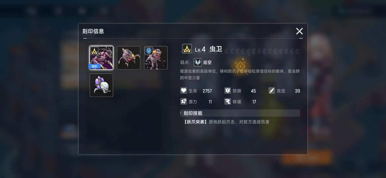 【金色荒野】各种各样的刻印横行,今天,咱们接着看一看其他刻印~ 虫卫 虫卫是噬源虫巢的高级单位,擅长使用锋利的爪子,穿透目标的躯体,是虫群的中坚力量。它的刻印技能【跃爪突袭】可以让虫卫原地跃起并爪击,对目标造成攻击伤害。虫卫属于强袭类,尤其惧怕指挥官的巡空克制。 锋镰兽 锋镰兽是噬源虫巢的中级单位,拥有一对源能附魔的上肢利刃对敌方造成极高伤害,其刻印技能【攻袭流血】可以对敌方造成流血。