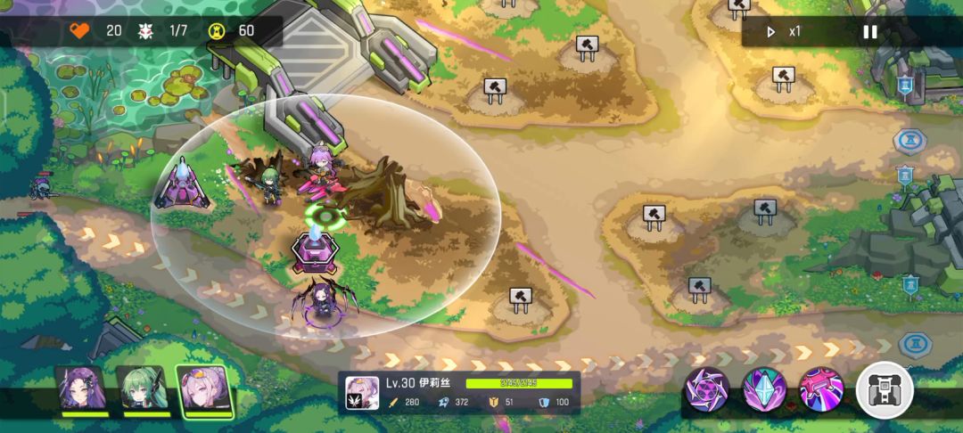 这种有河流阻挡的地形,飞行英雄畅通无阻!陆地英雄想过河就得等船过来,支援比较不方便。 我们一般进图,得看一下地形,根据地形来判断建在哪里。越往后,新出来的怪有不同的能力,飞行,快速,禁锢,偷塔,加血,爆炸等。优先级先打哪类型的怪。