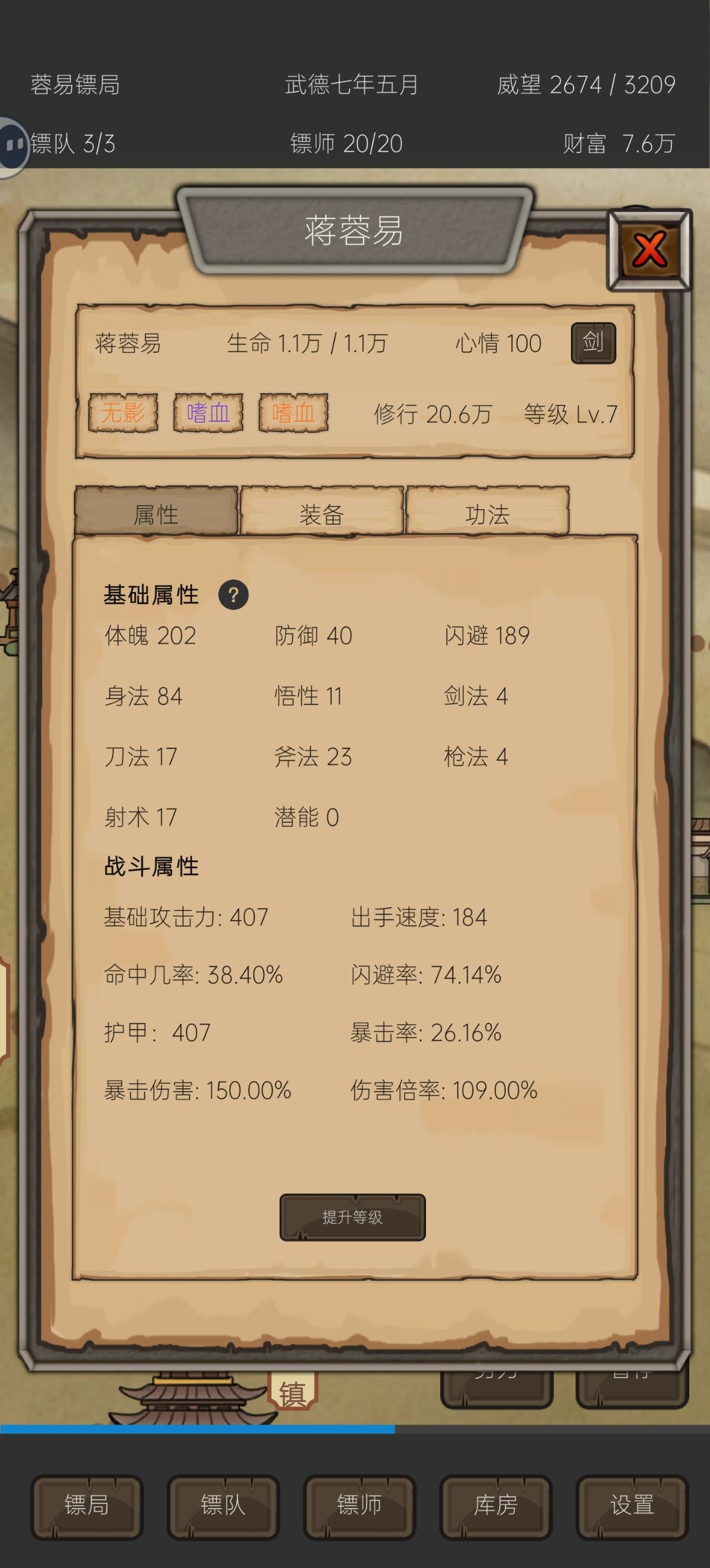开局选枪,群攻可以打4个人(要看下技能不一定是群攻)主角最好带个特性可以开局刷个几次,队友前期只要血厚,后期钱多随便换,把兑换码和镖局福利一领。招个2-3个队友就可以走镖了同级的镖选路程时间短金钱多的,就可以很快积累钱币了,有钱了之后就可以去打委托出武功秘籍优先给主角,主角毕竟不用给工钱,然后主角修行下生下秘技就可以打武林大会,会给属性点优先给体魄和主角的枪属性或者刀属性,循环一下就无敌了啊!