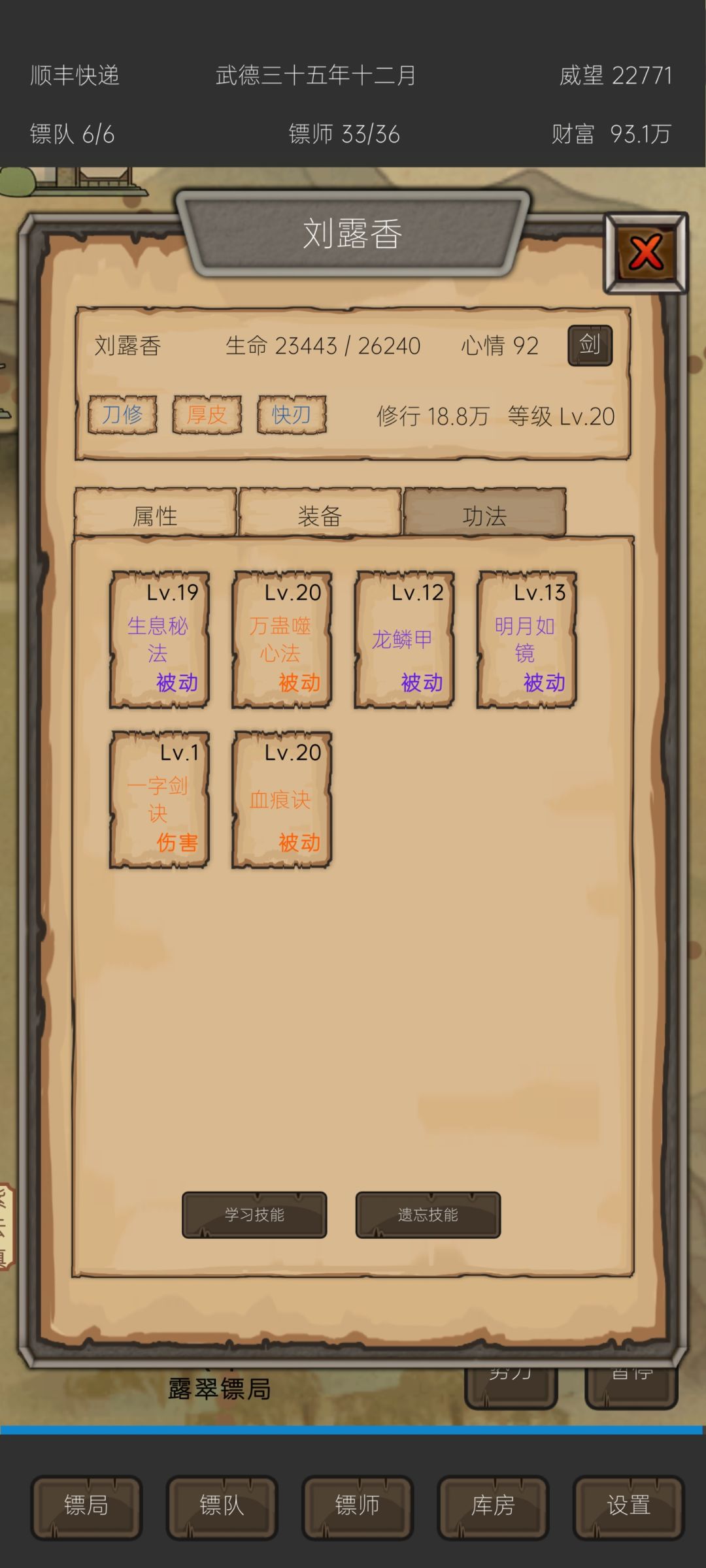1.生息秘诀,最优先升级,前期可以用嗜血天赋代替 2.龙鳞甲,防御效果好,前期可以用厚皮天赋代替,蓝色玄武甲也可以用来开荒 3.万蛊噬心法,效果极佳,炒鸡推荐,万能搭配,能打真伤能减对面攻击,适合十级以上的镖,弥补属性差距 4.血痕决,真伤效果,也是为了弥补十级镖的属性差距 5.明月如镜,加命中,不怎么升级 6.一字剑诀,不用升级,主要是为了打全部人,把真伤效果拉满,最好一队六个人都配一字剑诀 这