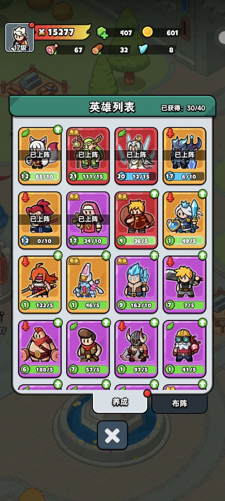肝了两天麻了,硬肝是真费劲儿啊,抽角色强化但手气非酋,训练营升级得需要等级到了才能升不然光肝蓝矿石也没用,卡到树精长老每次连半管血也打不掉得复活好几次但懒得浪费,金色角色也都是新服盛典啊活动啊领取的,但蓝色角色抽多了强化了比金色好用多了
