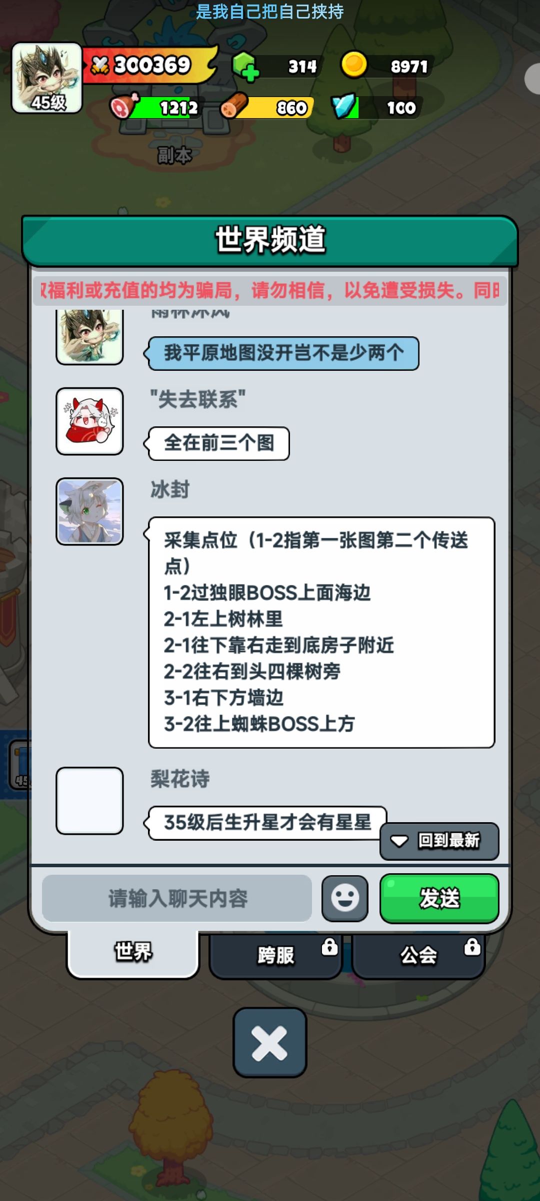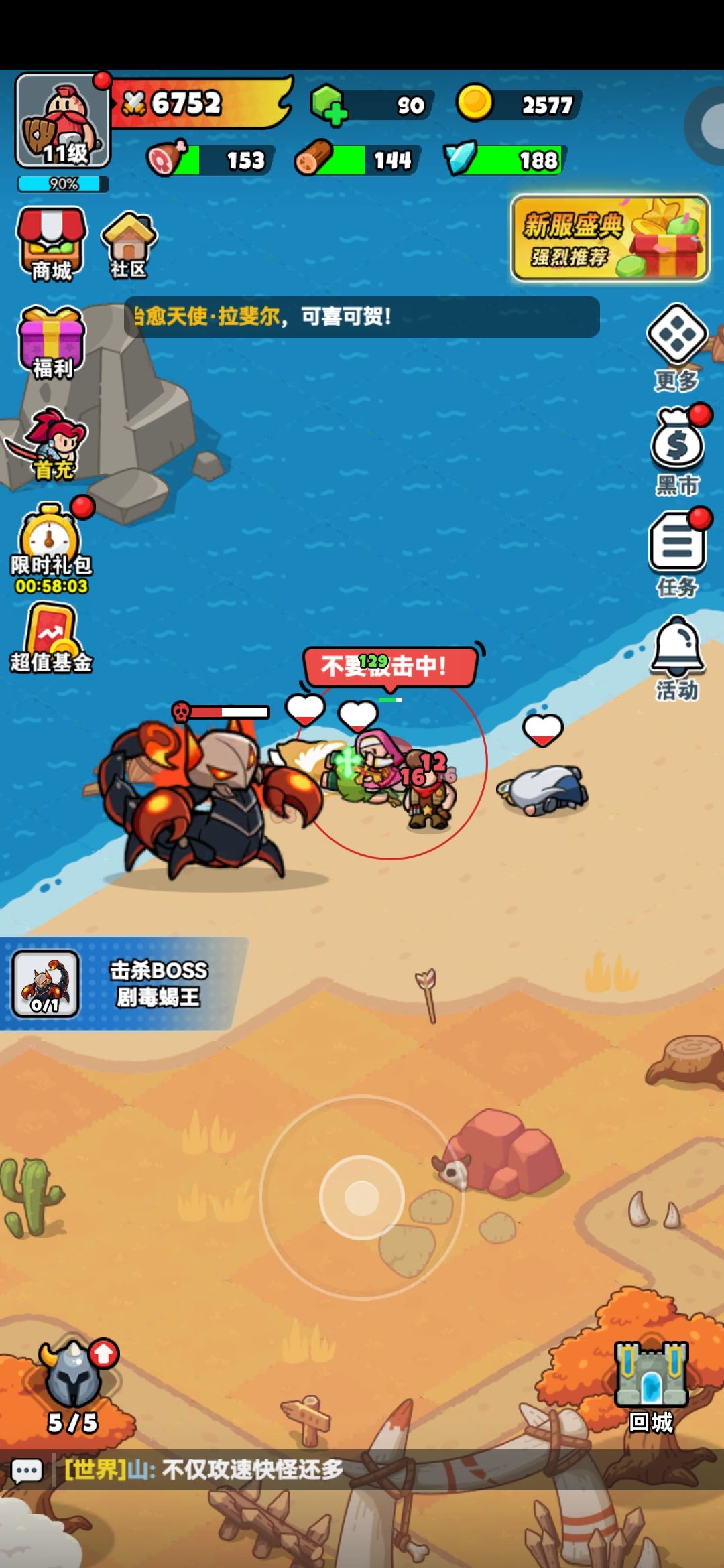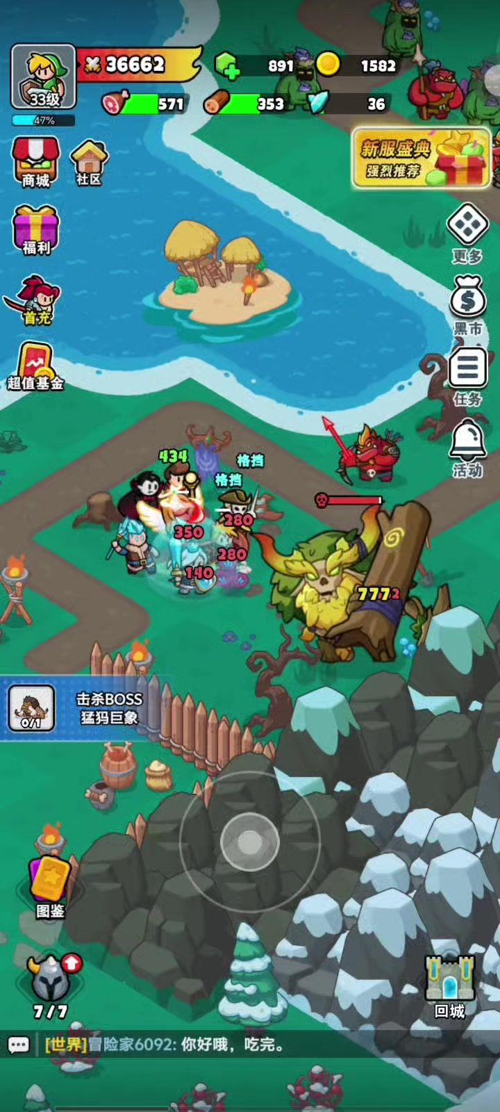 原地挂机了一天,一看手机,就从35级到43级了,是时候和雪人开战了(我要打十个),死了好多回总结的打法 开战前把boss周围的小兵和树木都搞了,中途小兵刷新尽快清除掉,中途就是围着boss转圈,主要是躲雪人的大球和大招,小怪刷新了一定尽快清,打一会就走,他大球抬手后会放三个连续大雪球,然后再接一个,有时还会再放三个,之后在他放小球时输出,值得注意的是boss大招伤害持续的,要等地面不冒白烟了在能靠