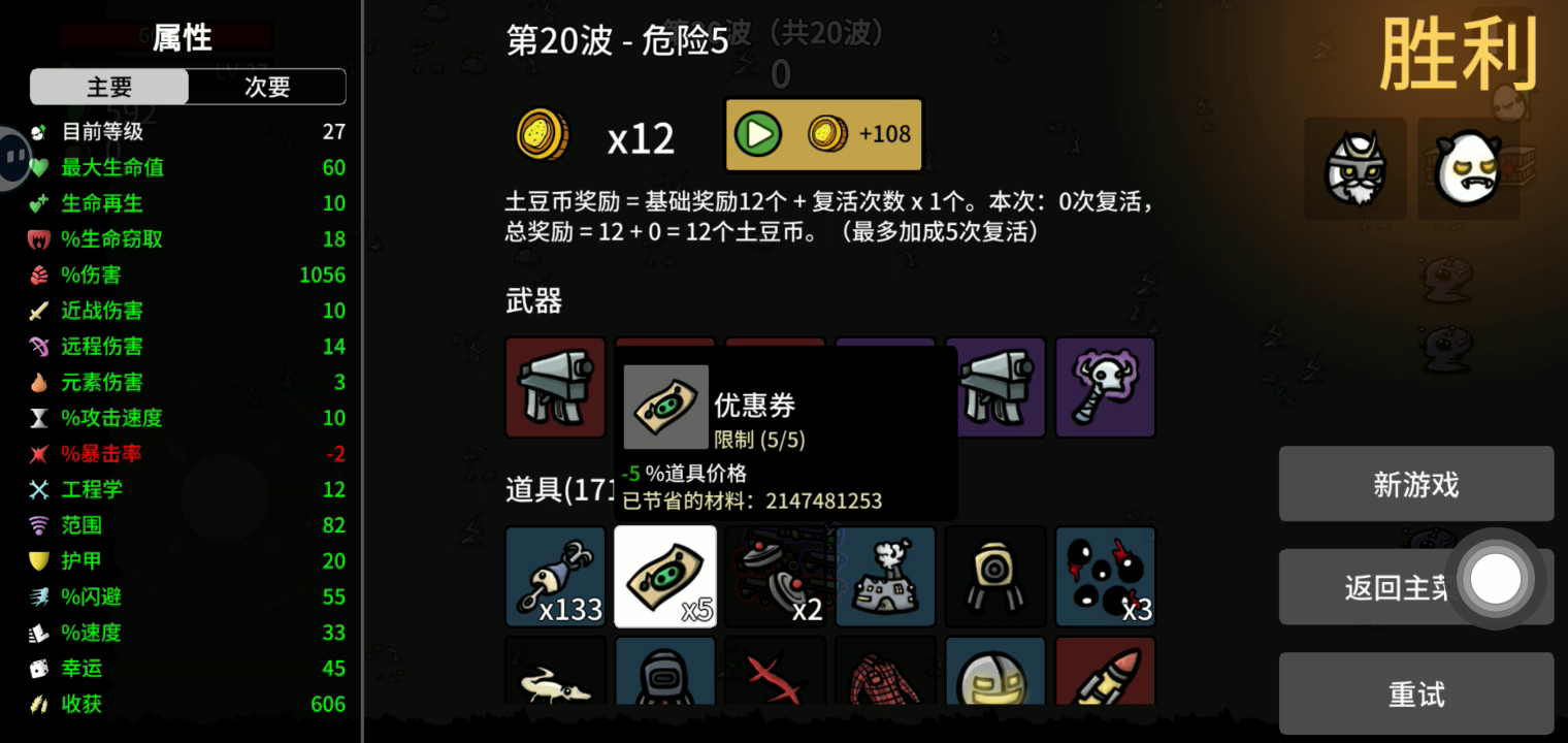 1.全能者最朴实无华的土豆,选冰锥点点元素就能轻松通关2.斗士新手前期没解锁利爪,只玩拳即可,注意点点回血等续航。3狂人最爽的角色之一,开局选盗贼匕首,卖掉初始小刀,然后狂点暴击。后面钱滚雪球起来了就无敌了。4游侠主买冲锋枪和霰弹枪,有怪潮可以买两把爆炸枪应对。猛点远程即可。5法师燃烧buff纯纯一坨,出伤慢伤害低,选冰锥随便打。6大壮园艺剪和幽魂法杖都可以玩,如果玩幽魂法杖