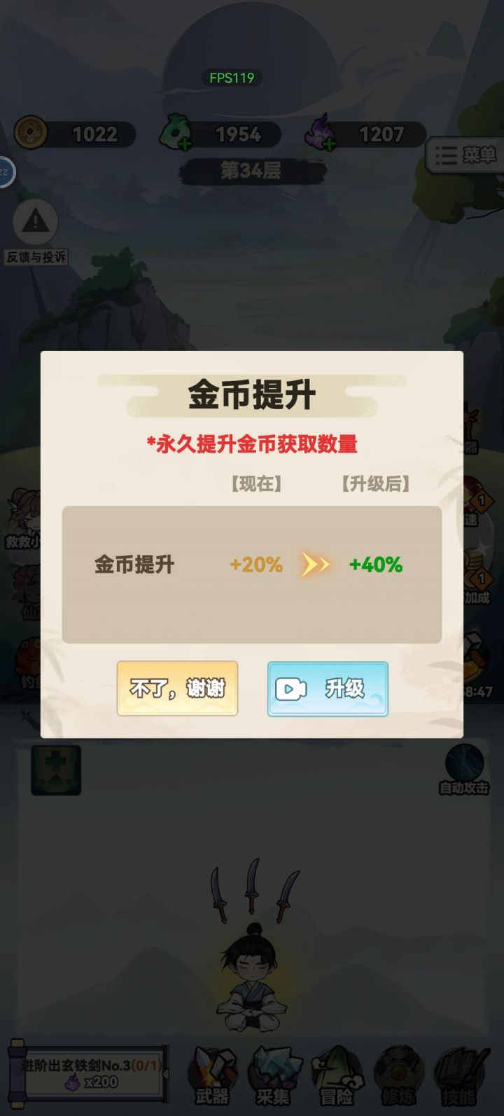 攻击倍速和金币倍率需要看广告35个,休闲玩玩还可以。修炼和仙友升级艰难,不看广告的话只能慢慢来,洞府是个好地方,能拿很多资源,不过升级也很难。目前玩到钓鱼,闲的没事做玩玩单机也还行吧。
