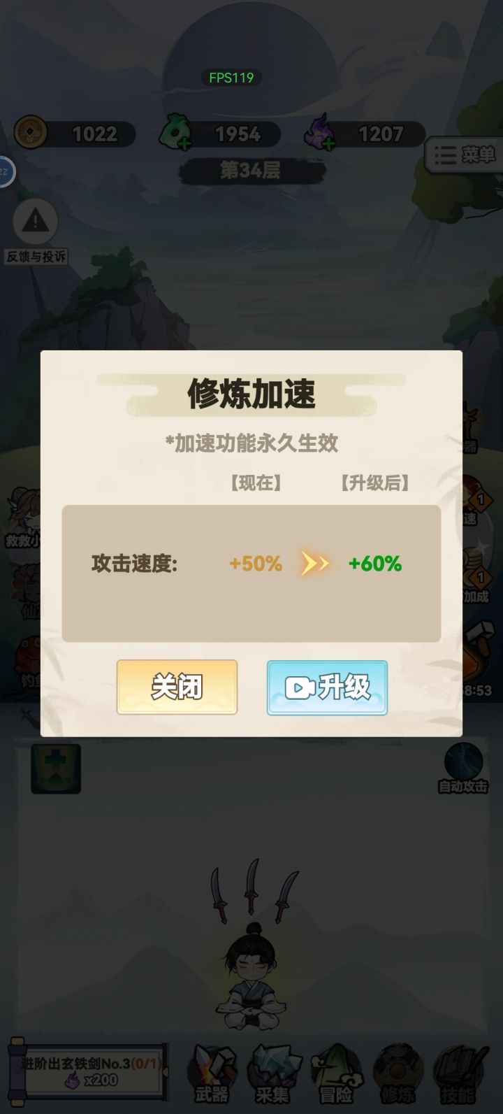 有广告但是它不收费啊(说的好像付费的舍得出钱一样),而且当划水游戏玩的话,就看个自动攻击和加速的广告就够慢慢打了。非想要高数值就直接升级满第一把剑(我不是,我摆烂党)