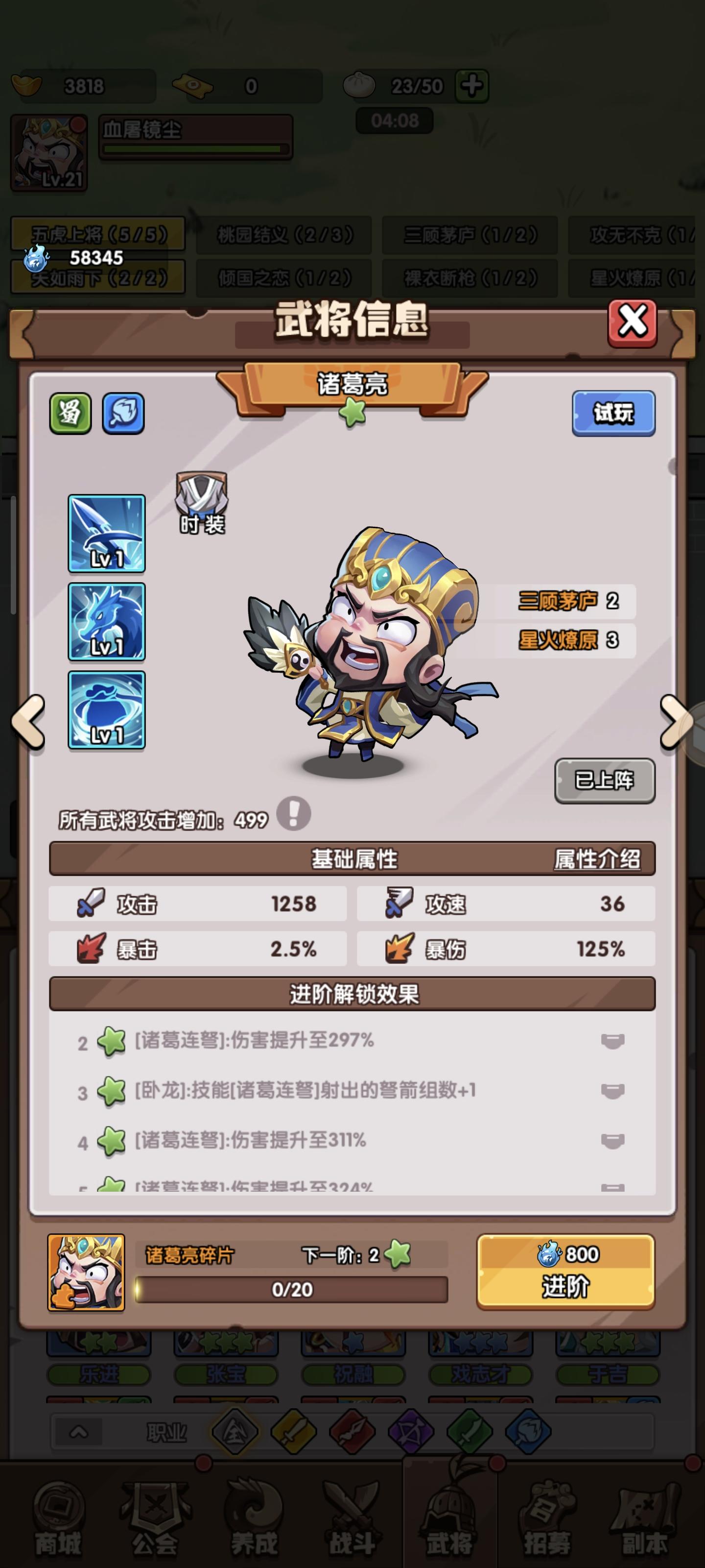 只花了不到100元,新区排行榜能排前三,这套阵容是真的强。唯一的难点在于开区需要刷一个诸葛亮。 只要你开区抽到诸葛亮,这个阵容就已经成型了,因为其他武将都很容易获得,目前第二天玩到了46关,其实还能往后闯,因为46关无伤过的。接下来开始详细介绍: 阵容构成:诸葛亮,赵云,黄忠,夏侯渊,貂蝉,最后一个位置关羽/张飞/马超任选其一。 上阵顺序: 1.重中之重,前三个一定要下诸葛亮。最好第一个就下诸葛亮