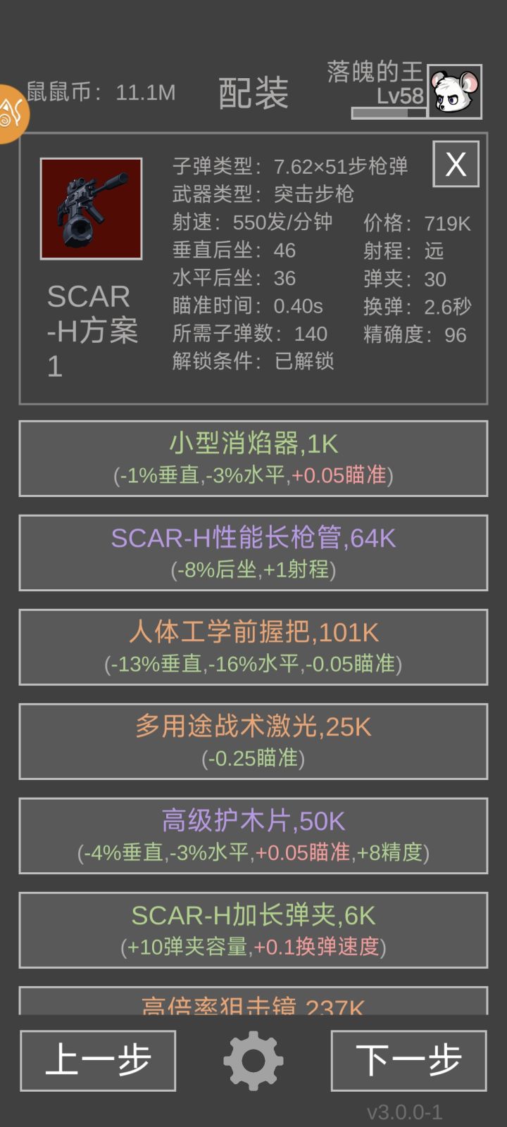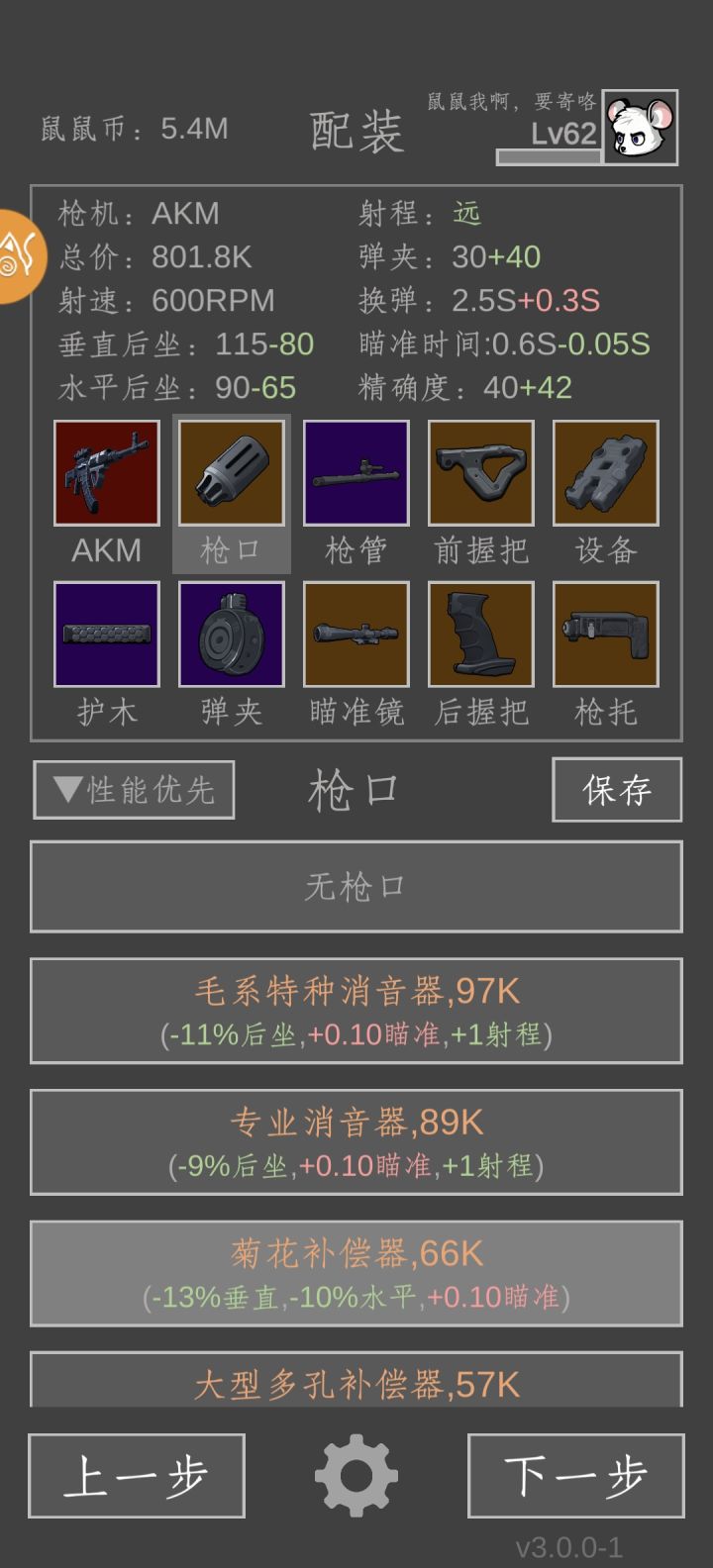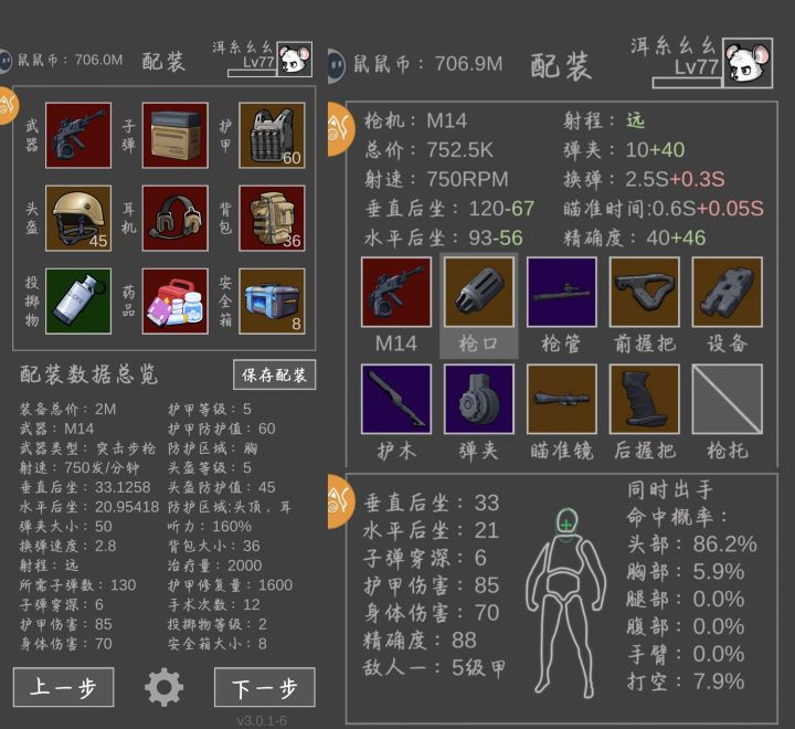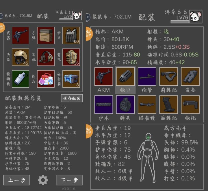 如图一所示满改akm搭配六级弹可以做到头部命中率100%,无论什么装备都是一枪死(除了航空鼠必打不过除非带队友)。单人下图时,闪光弹的加先手时间比榴弹之流的伤害重要很多,相当于变相增加自身的生存能力。而scar与akm的强度之争纯纯akm的射速更快秒人更快(都是头部100%命中率)