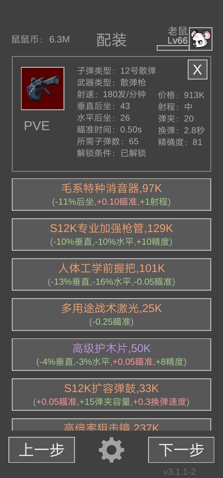 如图一所示满改akm搭配六级弹可以做到头部命中率100%,无论什么装备都是一枪死(除了航空鼠必打不过除非带队友)。单人下图时,闪光弹的加先手时间比榴弹之流的伤害重要很多,相当于变相增加自身的生存能力。而scar与akm的强度之争纯纯akm的射速更快秒人更快(都是头部100%命中率)