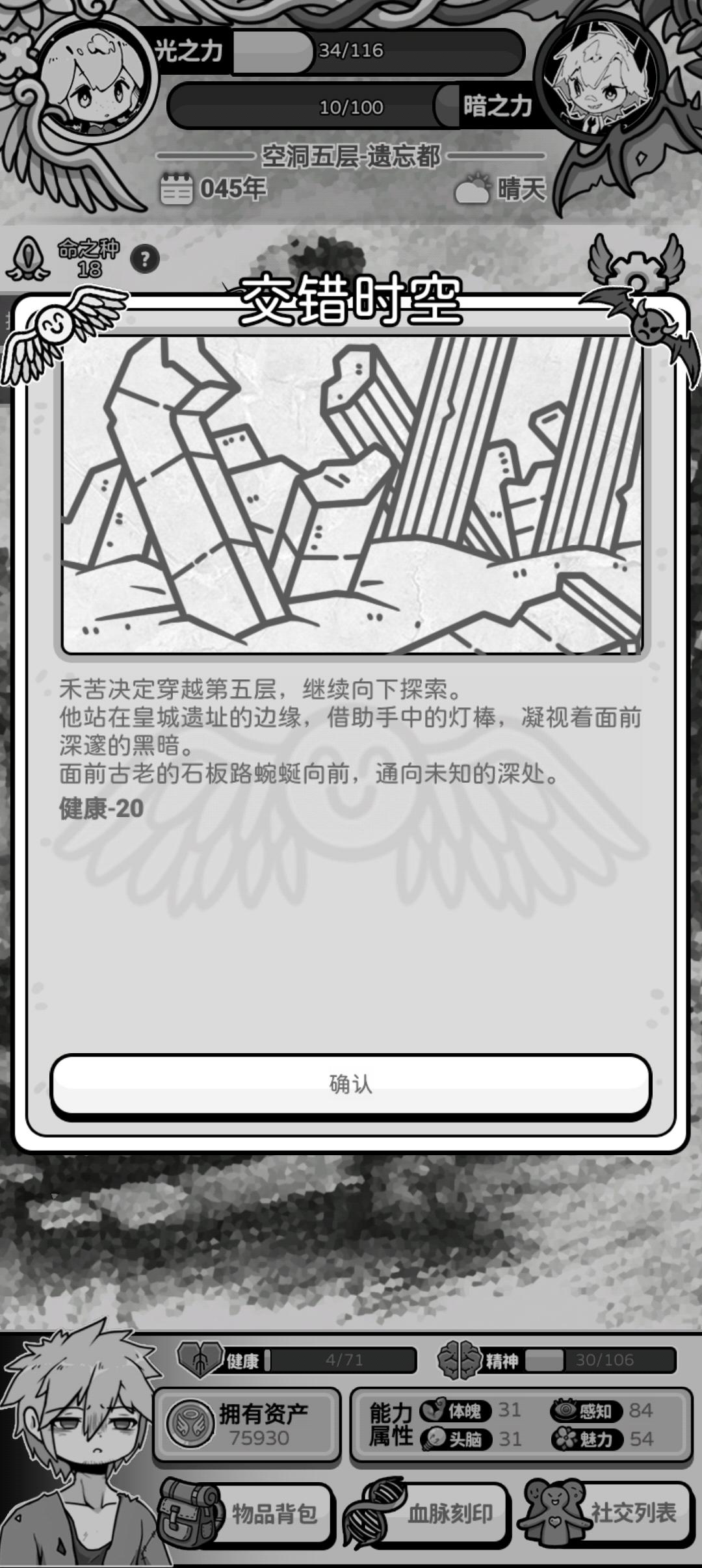 84岁之后,每3年精神会减18,健康不会减。撒旦审判时,召唤大天使直接赢 ,召唤上帝直接赢,删牌要赌第一回合删的不是撒旦不会用的。这样如果前面审判一次技能不用,运气好点活到120没问题 这里有个bug,天使4级buff每年加1健康和精神,如果84岁之后精神归零,主角会从登神之路走向天国之门。但到达天国之门后还有一次判定,由于此时跨年精神+1,判定精神不为零,主角会再从天国之门走回登神之路,相当于你