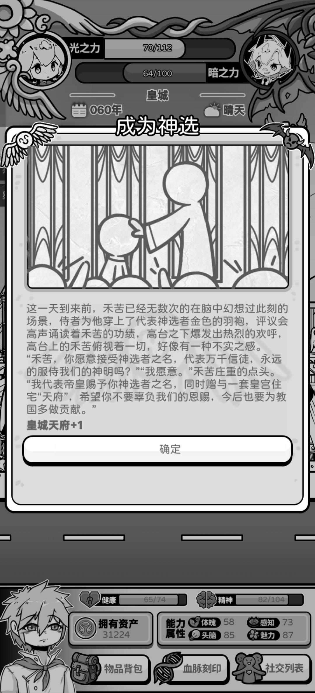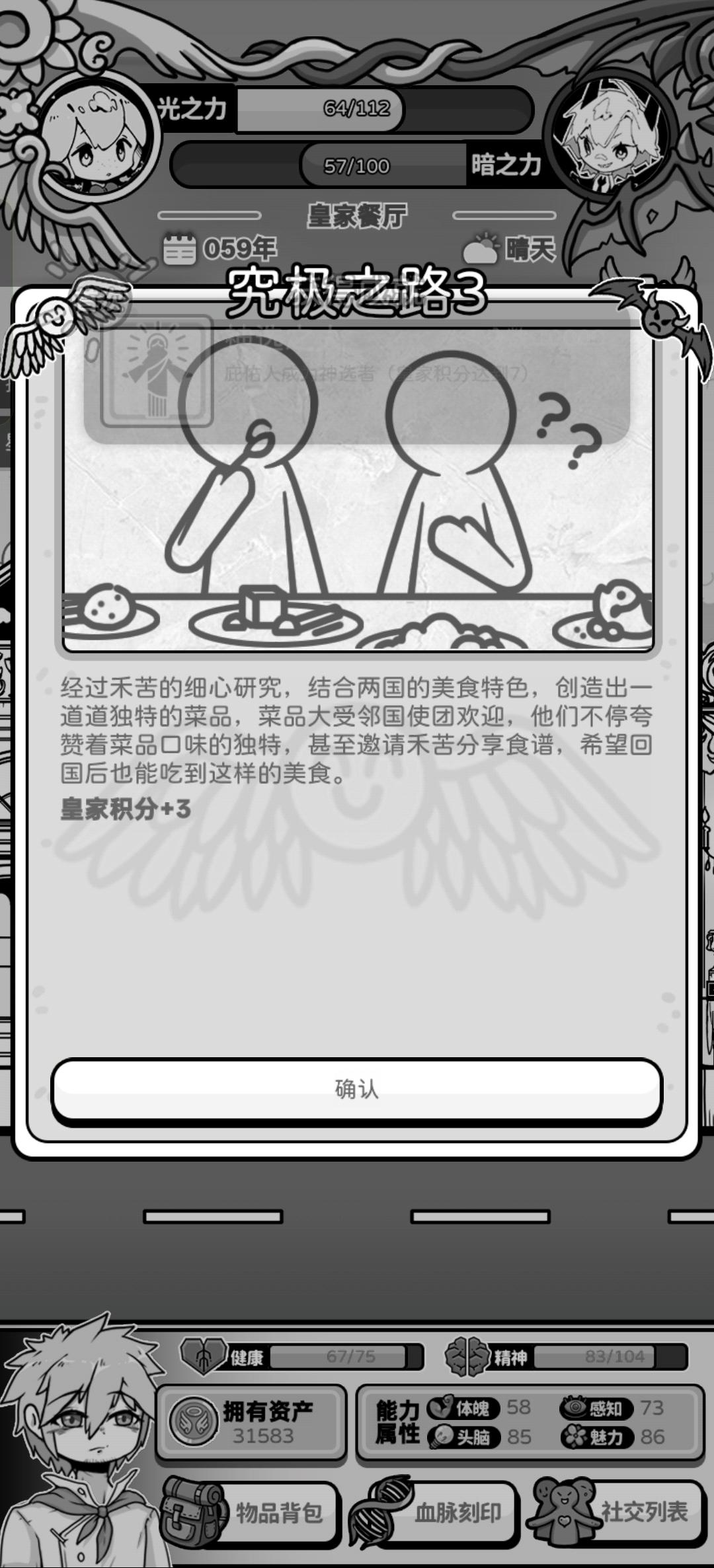 差不多把各种路线都玩了一遍,感觉前期最容易达成天伦之乐结局或者神选人生结局的就是流浪洞窟探索路线。第一次进流浪线时,我的府邸还是1级,各种数值卡得紧,没结婚,但感觉这条路非常挣钱,在30岁把宝石交给教会,31岁进行探索,到三层每次给8000,5层每次给32000。我感觉这条线是比较容易养小孩的,挣钱多,健康值和精神值维持也比较稳定,每次探险都会有三点健康值和精神值。隔几年去一趟疗养院或者餐厅,