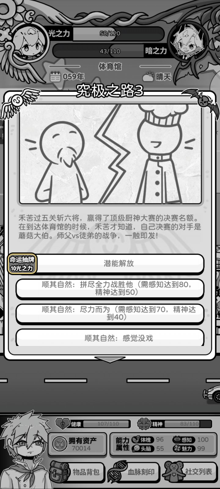 根据记忆写的,如果有变动以实际情况为准。神选人生需积分达到7,不然会落选,也无法开启神选人生线。干预或抽牌通常需要消耗10光之力幼年随机事件:最初的机遇:选项获得对应血脉,体魄/头脑/感知+10,前两个选项消耗10光之力抽牌,第三个不用次元隔膜:光之力+20美味的汤:健康+10,体魄+8小人物大智慧:暗之力+8,头脑+8,精神-10第一个玩具:精神+10,魅力+8贫困资助:大成功