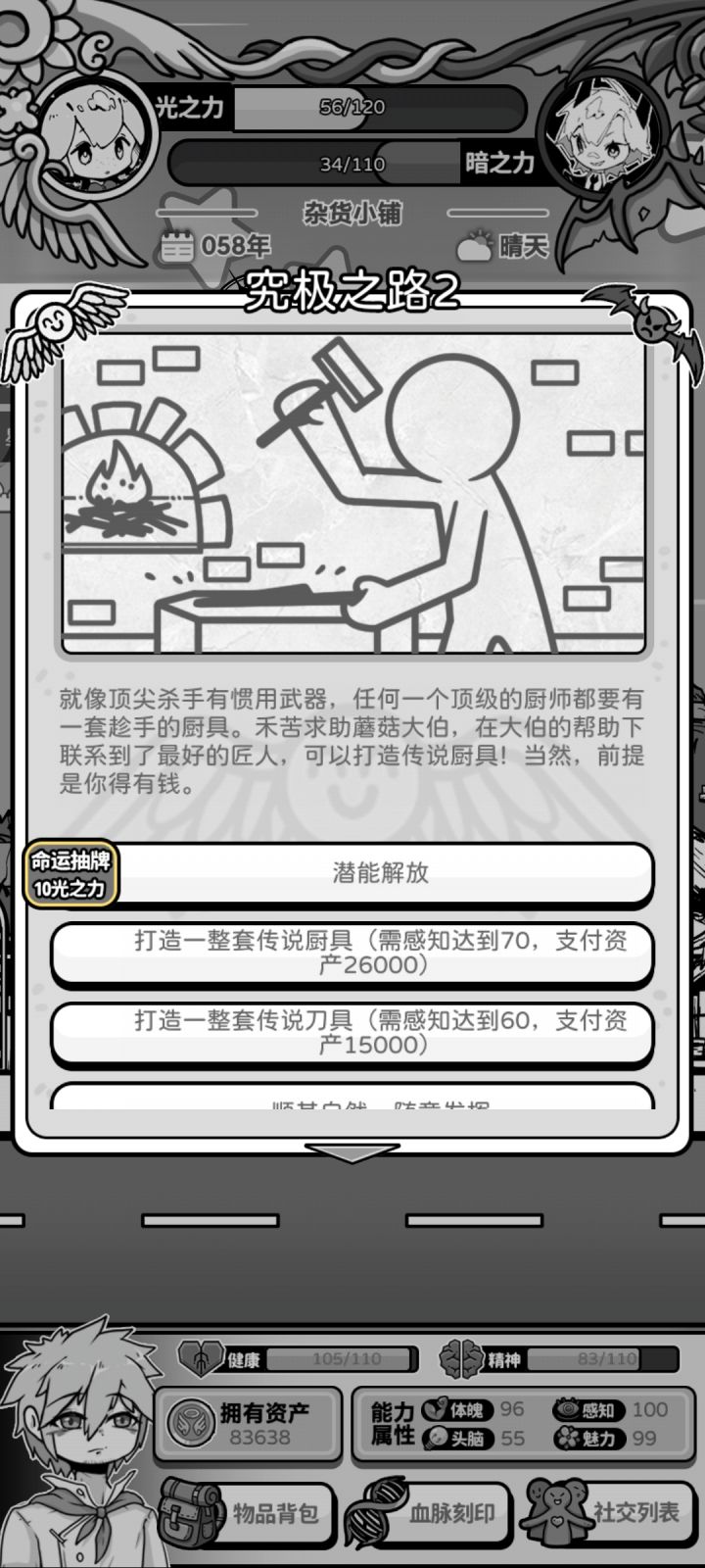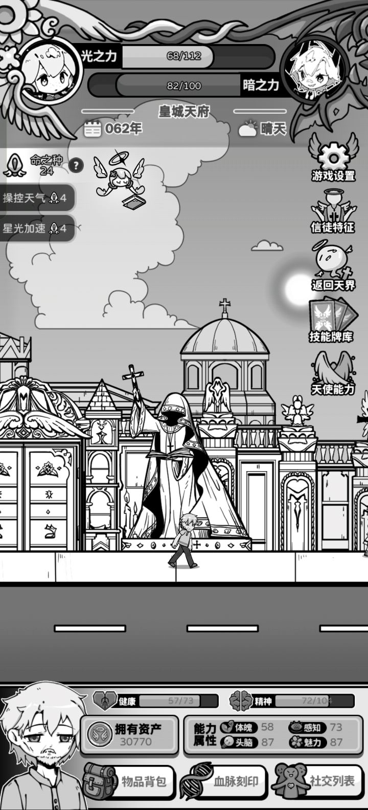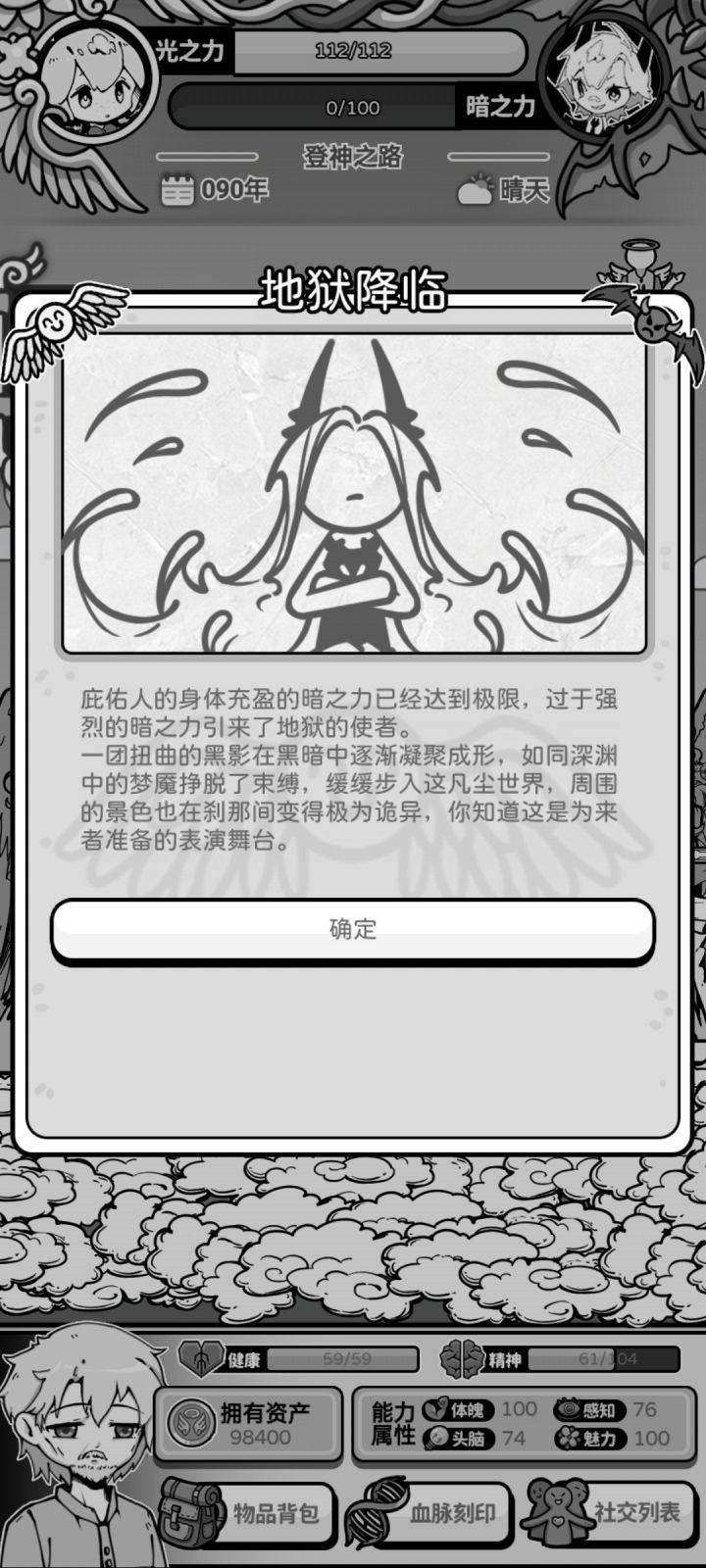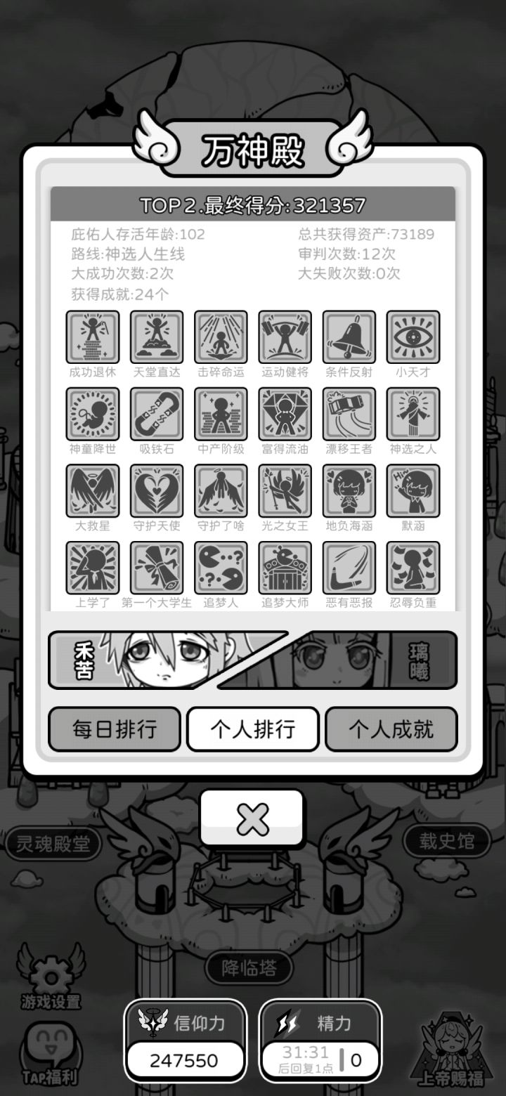 一般来说我感觉走学校游戏线最稳,打了几次都至少能活到退休(不过花的现实时间长一点,要刷信仰去生死胎就完事)因为刚上手没开刷,其他神没满好感,所以现在都没满技能没拿个108岁见笑了(′へ`、 )开局可看个三祝福的广告,适合玩多属性。刷个头脑魅力都比较高的开,点一点页面等正式走出初始小房子场景,这时头脑有近30多就是很好的局,有个小事件还会加5脑,其他就看祝福随机跳吧。9岁认识默涵,之后持续性