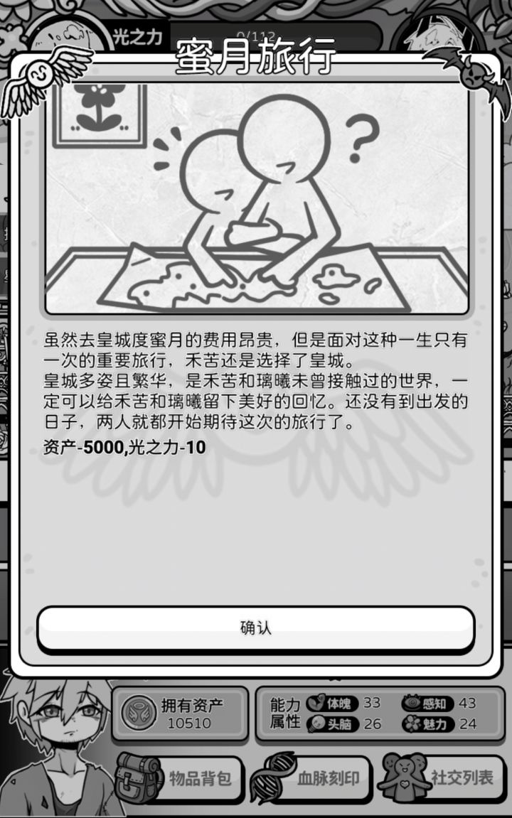 差不多把各种路线都玩了一遍,感觉前期最容易达成天伦之乐结局或者神选人生结局的就是流浪洞窟探索路线。第一次进流浪线时,我的府邸还是1级,各种数值卡得紧,没结婚,但感觉这条路非常挣钱,在30岁把宝石交给教会,31岁进行探索,到三层每次给8000,5层每次给32000。我感觉这条线是比较容易养小孩的,挣钱多,健康值和精神值维持也比较稳定,每次探险都会有三点健康值和精神值。隔几年去一趟疗养院或者餐厅,