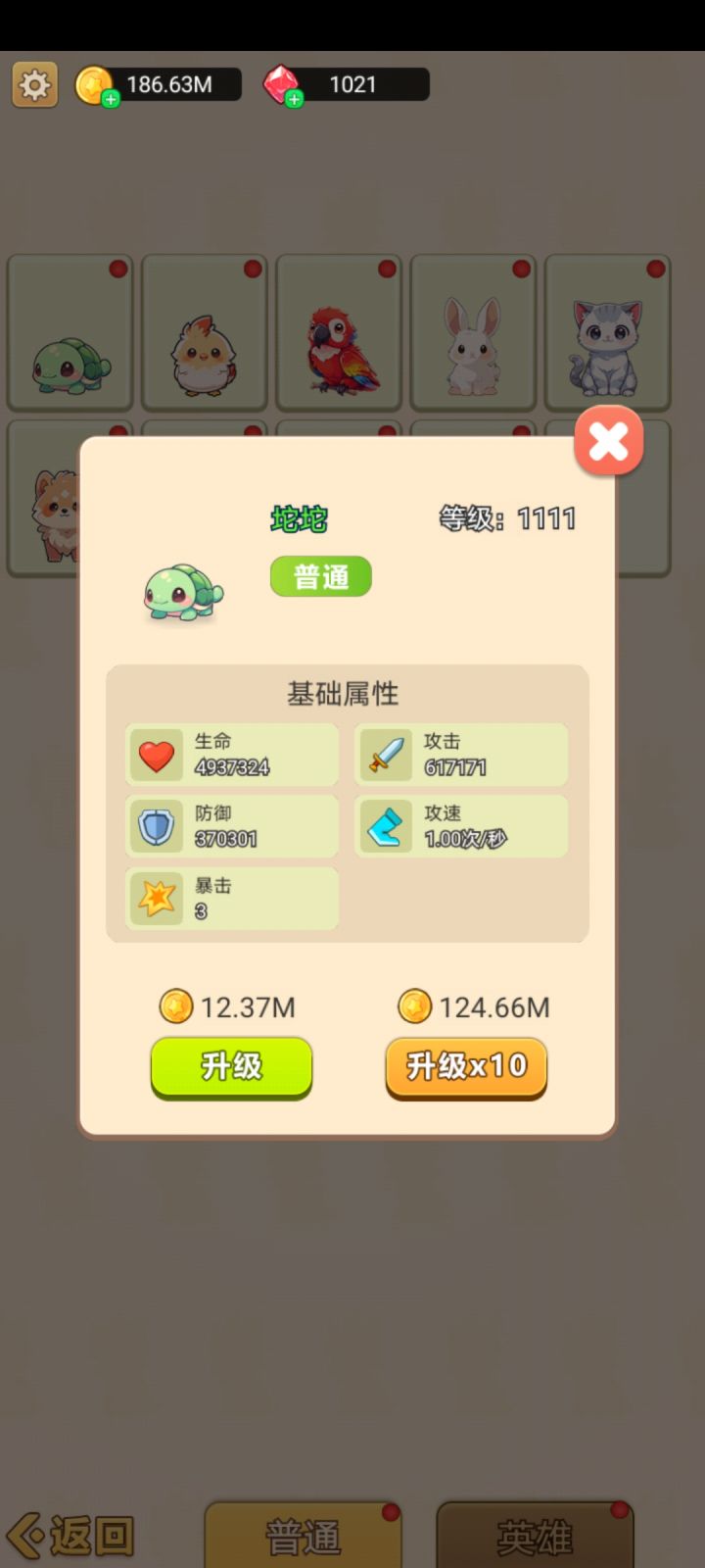 别玩,Bug特多。关不了声音。钻石买碎片有时候买了,没碎片,钻石也没了。点击太快会卡住,动不了。打不过下一关,撤回上一关,通过又打会上一关,奖励变少(例:40关打不过,撤回39关,39关过了自动打40关,不可以一直卡在39关)。还有就是5个两边的宠物的攻击打不了BOSS,只有中间的3只可以,这怎么可能通关。