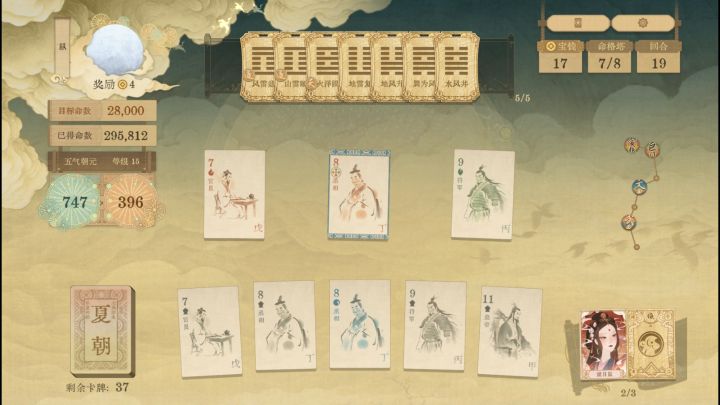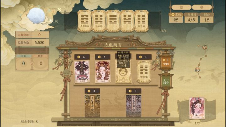 卦象牌是有各种功能的,有的会加命数,有的会加倍率,我特别喜欢每个弃牌次数增长40命数的卦象,如果一次没用就是稳定160的命数,如果和北斗组合,那么至少是200的命数。倍率的话根据五行结算、根据职业结算的都有,需要玩家自行选择。卦象这个东西也是可以随时卖,不用担心5格的上限。