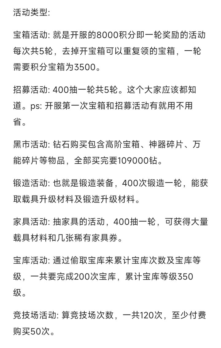 第一周活动为抽角色与开宝箱,前期可以先开着,等最后两天的时候自己看看能不能够一轮再用就好了,钻石活动要10万买完记得别乱用招募养葛就好了,前期平民c另外两个养成难度有点高自己可以酌情选择锻造活动在第二周,家具活动在第三周。 宝箱前期都留留,后面看自己箱子积分如果到了17000可以把绿色开了缓解金币压力,资源基本都是留着等活动的,不够一轮不用抢抽留着等下一轮就好了,推图推荐一号葛的图,推塔用五