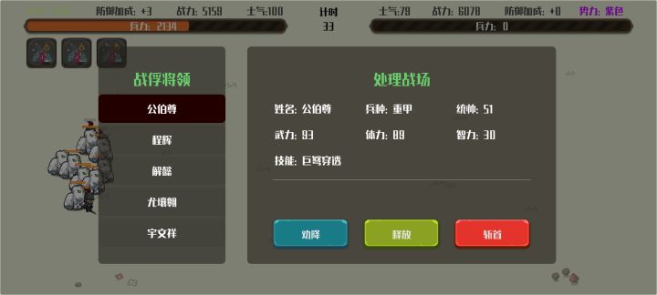 如题,招降概率比三国群英传低了很多倍,玩家不杀将的话大多数时间都会浪费在抓将上面。建议出个一键搜索你用的三国的地图武将名字也搞成三国的名将多好,这一堆莫名其妙的名字玩着毫无感觉一队只有5人,如果一个城不止5人游戏处理得就很乱