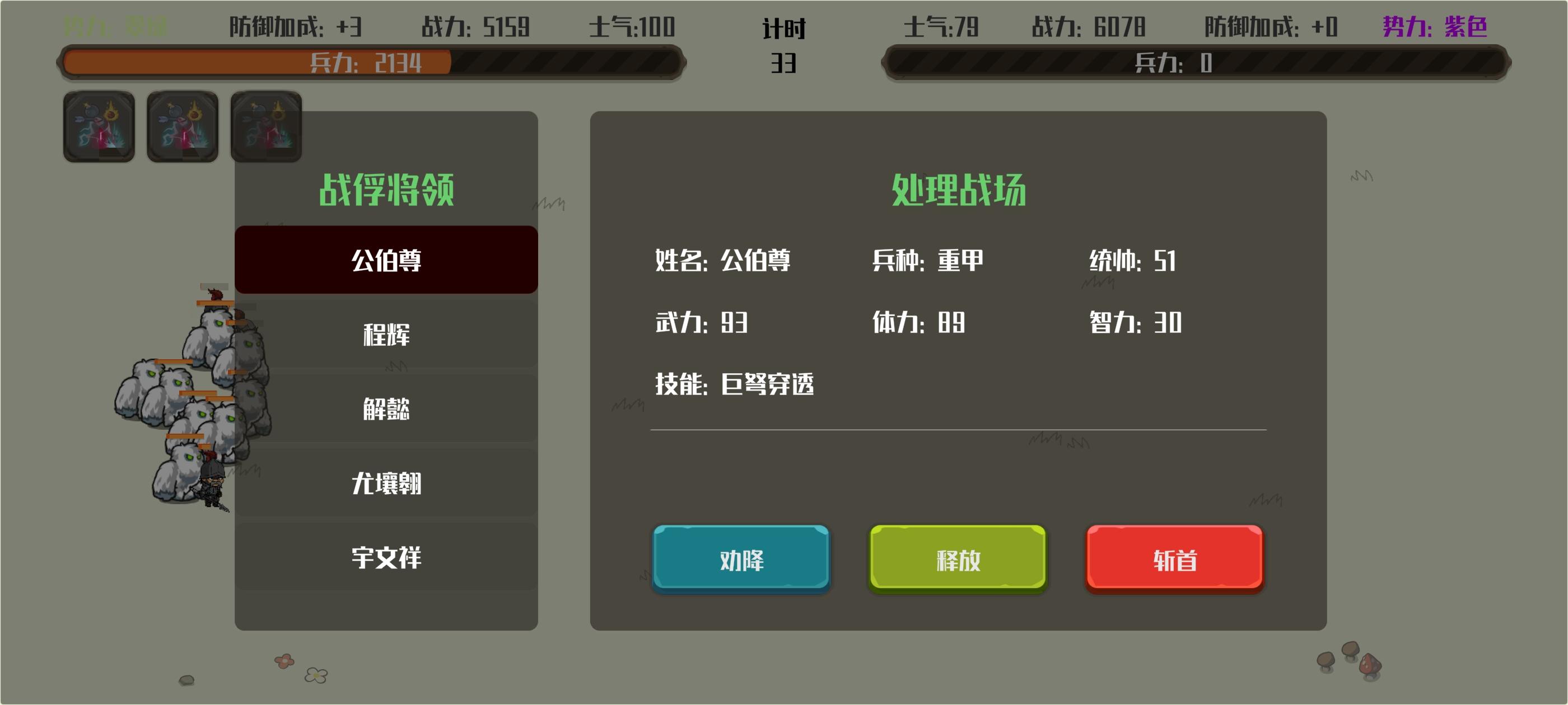 如题,招降概率比三国群英传低了很多倍,玩家不杀将的话大多数时间都会浪费在抓将上面。建议出个一键搜索你用的三国的地图武将名字也搞成三国的名将多好,这一堆莫名其妙的名字玩着毫无感觉一队只有5人,如果一个城不止5人游戏处理得就很乱