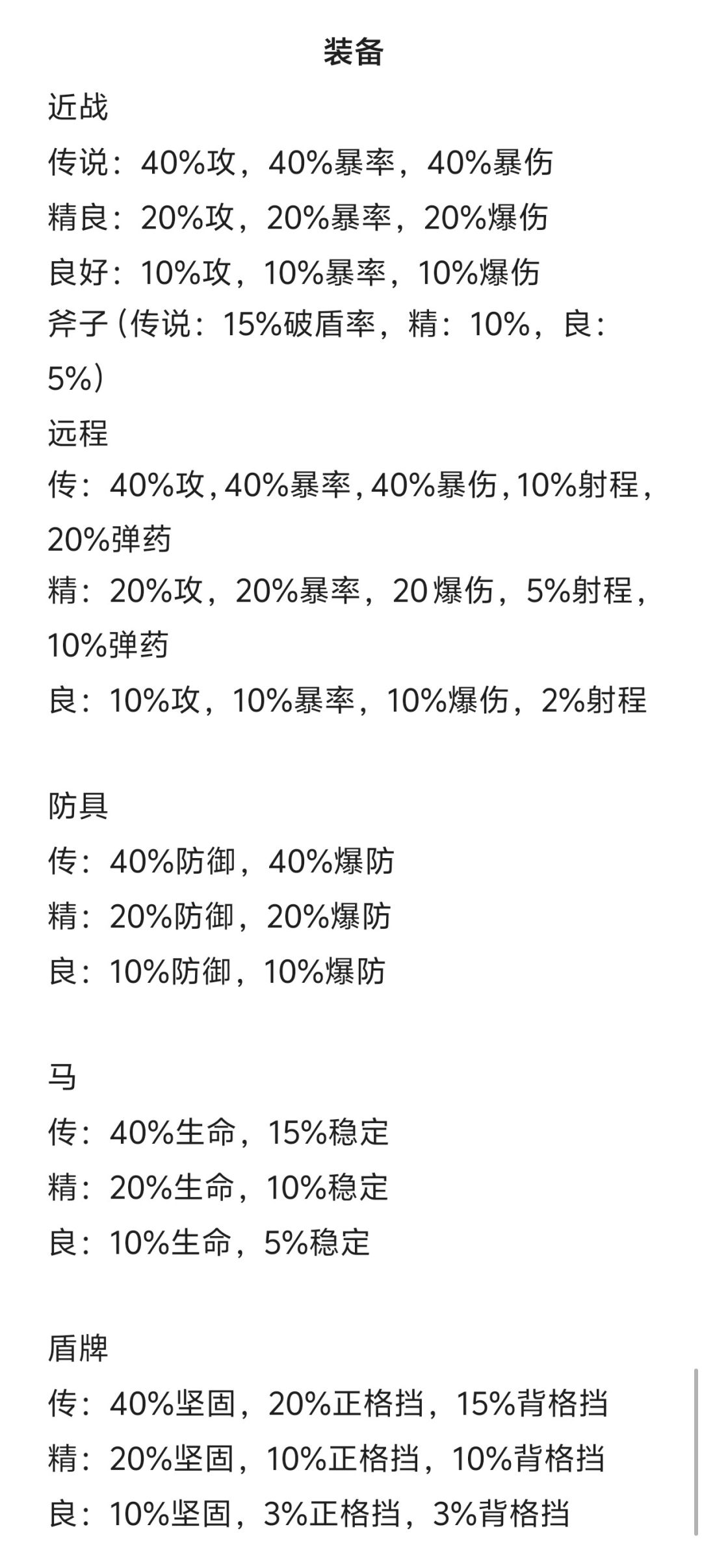 力:增加攻击力,1属性=0.5%攻击力,攻击力=装备攻击力+装备攻击力×(属性×0.005) —— 体:1属性=20生命上限 —— 技:1属性=0.5%暴率,暴率=装备暴率+装备暴率×(属性×0.005) 爆伤=装备爆伤+装备爆伤×(属性×0.005) —— 智:属性×0.4=学习速度% 武器熟练度(熟练度升级公式,总经验×武器种类÷3)总结同类型越多升级越快 骑枪加攻击,每一熟练度加0.2%攻击