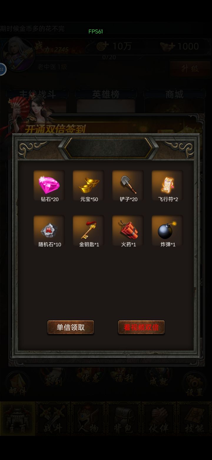 以下是我本人玩了20来天的经验心得,如有更好的玩法大佬们可以指点下。 开局必选法师,目前玩到135级,2个职业都做了测试,前期还是玩法师最优。开局在界面福利里兑换cdkey:666,888,钻石元宝大礼包,我要补签。然后在签到界面直接补签前面日期拿奖励。有条件的直接氪一波3卡加快进度,钻石前期最好留着不用乱用,在商店里的钻石商店每天兑换积分,提升vip等级。vip等级越高快速战斗时长越久,次数