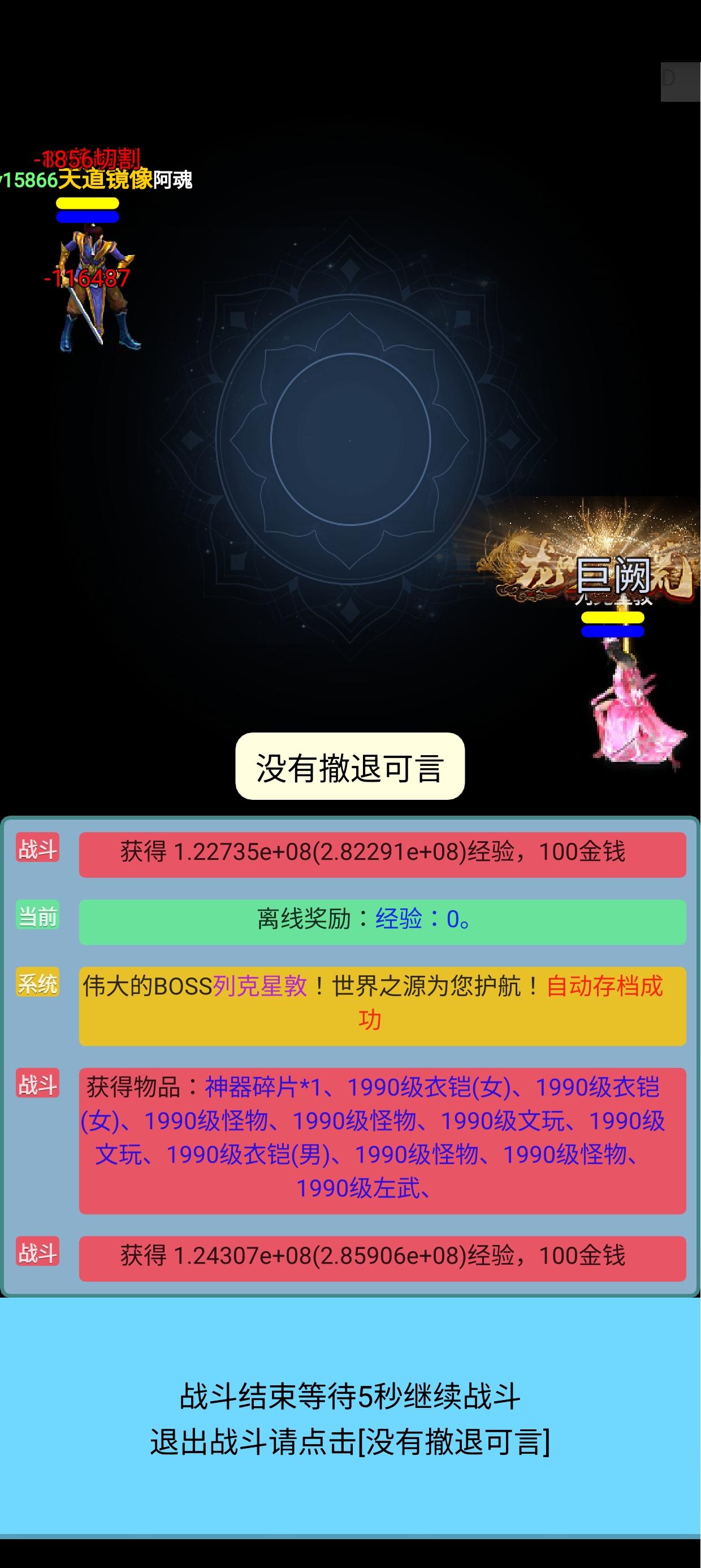 还有谁,一天二十四小时的在线挂机挂了两个半月,百分比神器全部三千级。镜像等级几近四千万,现在快玩到头了,刷一次图将近三千万亿的经验。换成等级需要近十秒,如果这方面不优化的话,这游戏现在也就到头了。等级太高的弊端就是不能离线挂机经验了。不然挂机一天上线要读取一星期,中途还不能退出,一旦退出存档就会损坏这谁受得了
