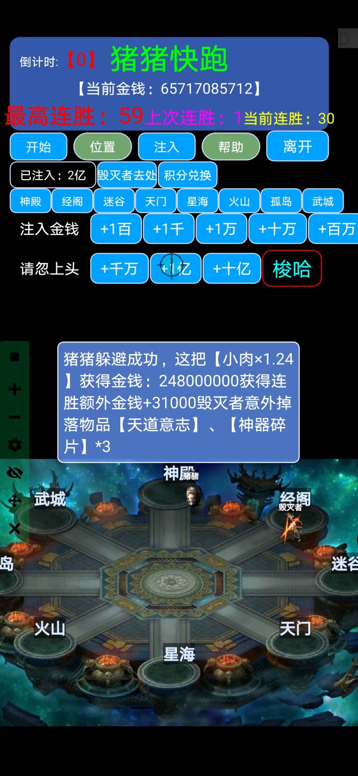 就是金币越来越多,越来越多,根本停不下来啊,从几百万到几百亿,意志快一百个了,神器碎片几百个可以忽略,挂了近十小时吧(这里自动下注用了连点器,良心的作者可以弄个自动下注🙂)。总结:刷BOSS出意志几率太低了,两百多门票刷完竟然一个都没出,躲猪猪很良心,新人刚建号就能玩,希望作者大大别改这个几率。神器碎片钓鱼二十级好像能出,没有测试过,谁试过来聊聊几率如何