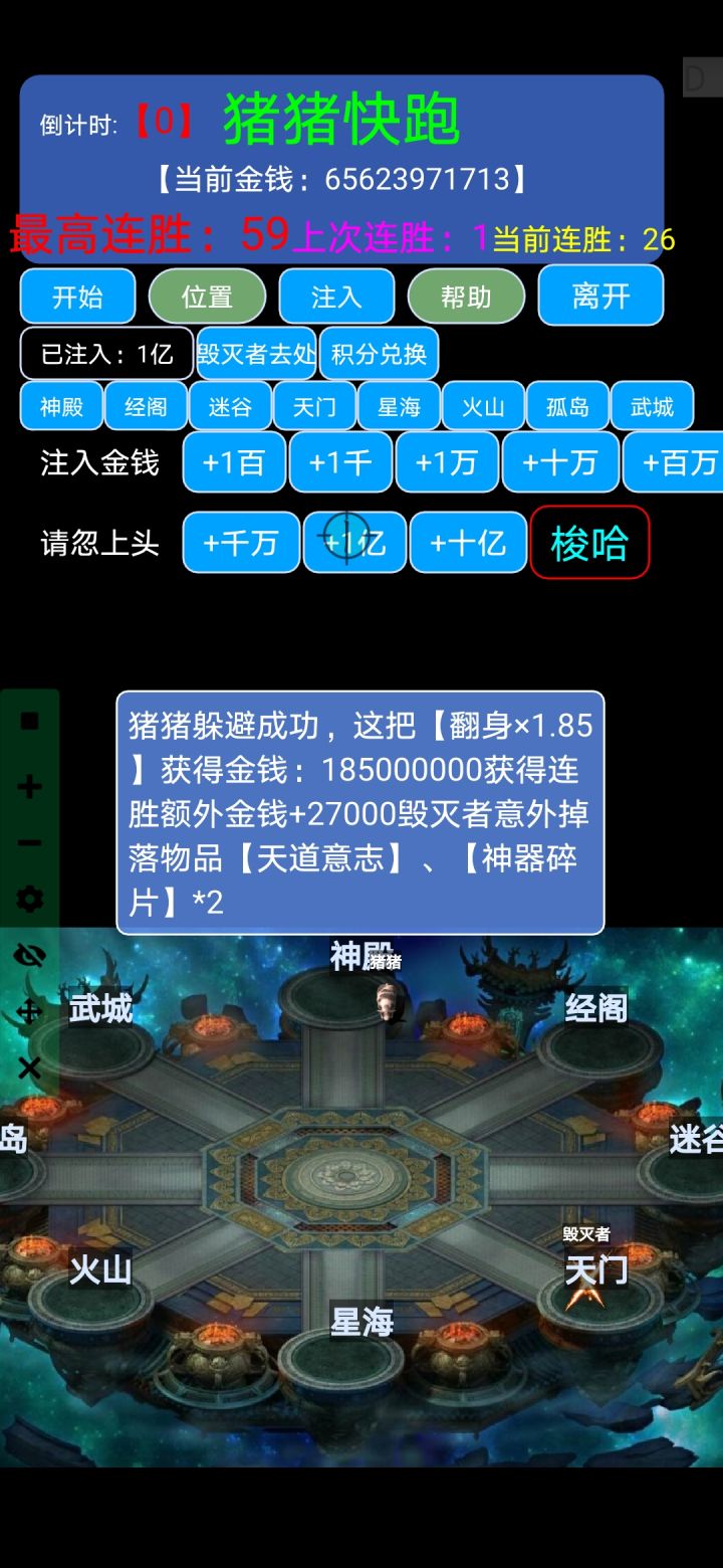就是金币越来越多,越来越多,根本停不下来啊,从几百万到几百亿,意志快一百个了,神器碎片几百个可以忽略,挂了近十小时吧(这里自动下注用了连点器,良心的作者可以弄个自动下注🙂)。总结:刷BOSS出意志几率太低了,两百多门票刷完竟然一个都没出,躲猪猪很良心,新人刚建号就能玩,希望作者大大别改这个几率。神器碎片钓鱼二十级好像能出,没有测试过,谁试过来聊聊几率如何