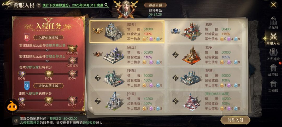 跨服入侵,每周的星期二开启,有四个任务,达到分数可以领取宝箱,可找人互刷,或者等晚上9.30激战公爵开始,顺便完成守护和入侵任务,公爵分两轮,如果第一轮是自己服可先去守护公爵完成守护任务,等到第二轮再去打公爵,反之则先去其他服打公爵,第二轮回家守护#神域纪元 #发现好游戏