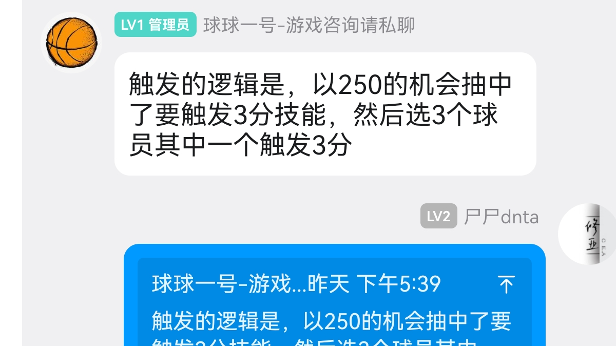 我怀疑,这个游戏所有配队攻略都写错了。大部分攻略都在教你,3个3分也好,3个中投也好,凑齐两个罚球等等等,总之凑同技能角色凑到技能能承载的上限。。然而当我看到技能说明里面1~3个技能的触发概率是递减的,我就在想,难道第二个第三个技能收益不是更低吗。于是我第一件事就是加Q群,先问问策划这个游戏的最核心问题。当三个同技能时,比如三个三分技巧。触发概率是110/170/250,这个含义是是什么?是